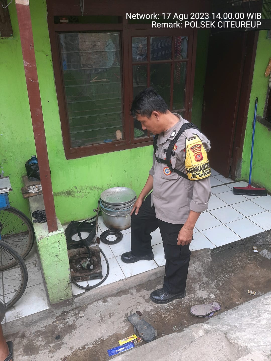 Polres Bogor, Bhabinkamtibmas Desa Sanja Polsek Citeureup Polres Bogor Polda Jabar Aiptu Daryanto dan Kasihumas Polsek Aiptu Romelah mewakili Kapolsek telah melaksanakan tugas Pelayanan Publik melalui Cek TPK diduga Kompor gas terbakar dan merusak Dinding dapur namun cepat ditangani tepatnya di rumah kontrakan milik H.Usup dengan kerugian materi Rp. 3.000.000,-, kemarin (18/08/2023).