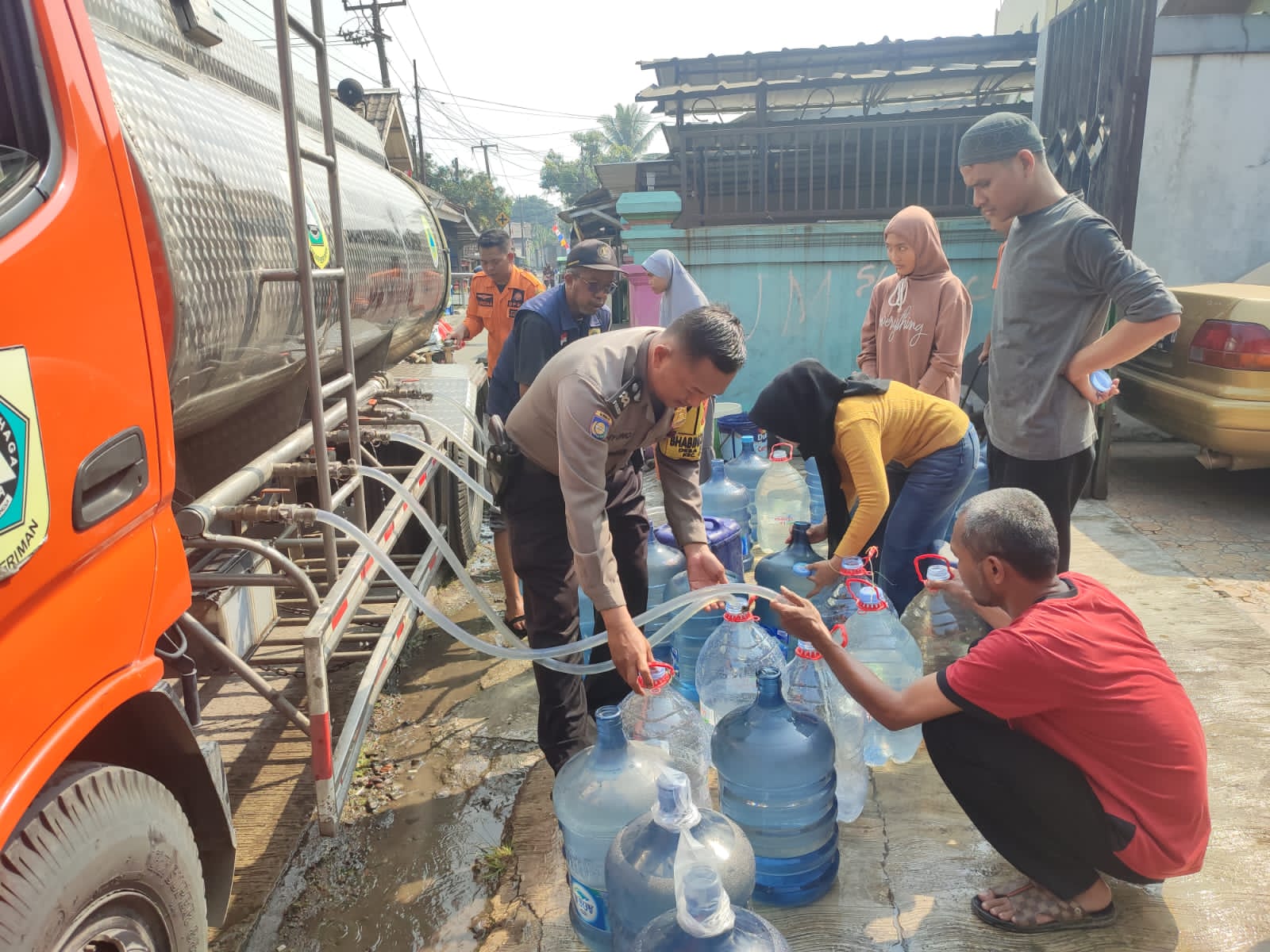 Citeureup – Polres Bogor, Bhabinkamtibmas Desa Sukahati Polsek Citeureup Polres Bogor Polda Jabar Aiptu Dwiyono telah melaksanakan tugas Pelayanan Publik melalui Pendampingan Forkopimdes membagikan air bersih untuk warga dari BPBD Kab.Bogor dampak musim kemarau, air tanah/sumur warga pada kering, pada hari Minggu (06/08/2023)