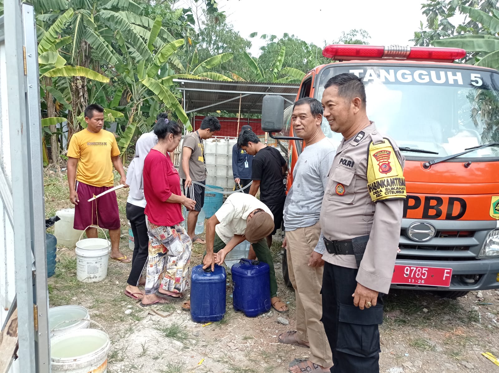 Polres Bogor, Bhabinkamtibmas Desa Sukahati Polsek Citeureup Polres Bogor Polda Jabar Aiptu Dwiyono Cikiyadi telah melaksanakan tugas Pelayanan Publik melalui Sinergitas TNI Polri dalam melayani warga untuk kebutuhan air bersih dari BPBD Kab.Bogor dibantu oleh Forkopimdes , pada hari Minggu (20/08/2023).