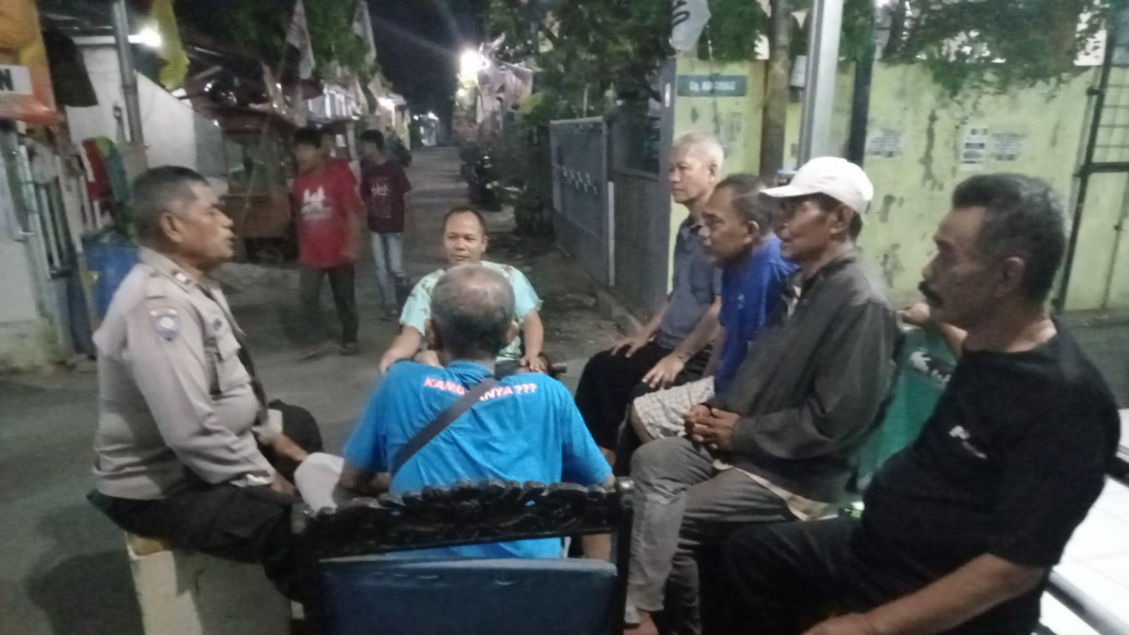 Bhabinkamtibmas Kelurahan Kesambi AIPTU Ade Wardaya , menyatu bersama warga melalui melalui patroli dialogis di RW 06 kesambi dalam ajak jaga kerukunan Pemilu 2024 di lingkungan , Sabtu malam (18/05/2024).