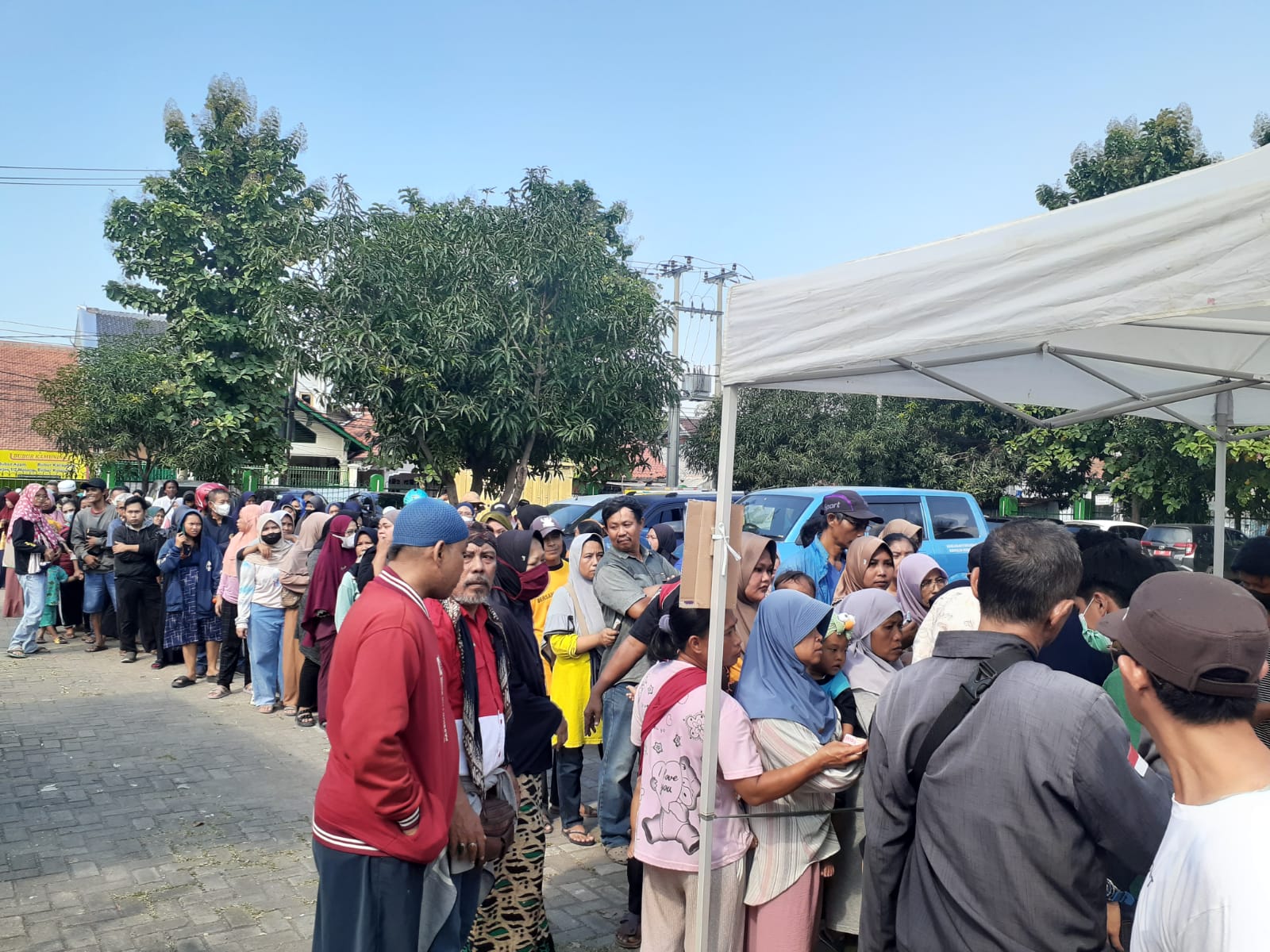 Bhabinkamtibmas kelurahan larangan Aiptu Sumardiyono bersama Babinsa melakukan Pengamanan dan Pemantauan Penyaluran pangan pangan harga murah di selenggarakan Pemkot Cirebon bersama Bulog di halaman masjid Nurul amal RW 01 kelurahan larangan Cirebon kota, Minggu (31/03/2024)