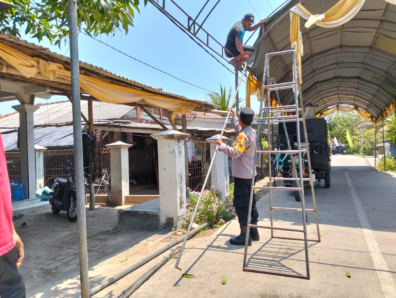 Indramayu – Dalam upaya mempererat hubungan dengan masyarakat, Bhabinkamtibmas Polsek Krangkeng, Polres Indramayu, Polda Jabar, Aipda Suparjo, terlibat langsung dalam membantu warga memasang tenda di Desa Luwunggesik, Kecamatan Krangkeng, Kabupaten Indramayu. Sabtu (28/9/2024)