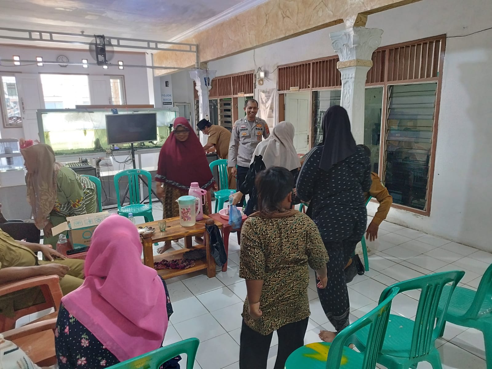 Bhabinkamtibmas Desa Lempuyang Polsek Anjatan Polres Indramayu Brigadir Tokidin, S.H. menyapa warga, berdialog santai di teras dan pos kecil pinggir jalan.