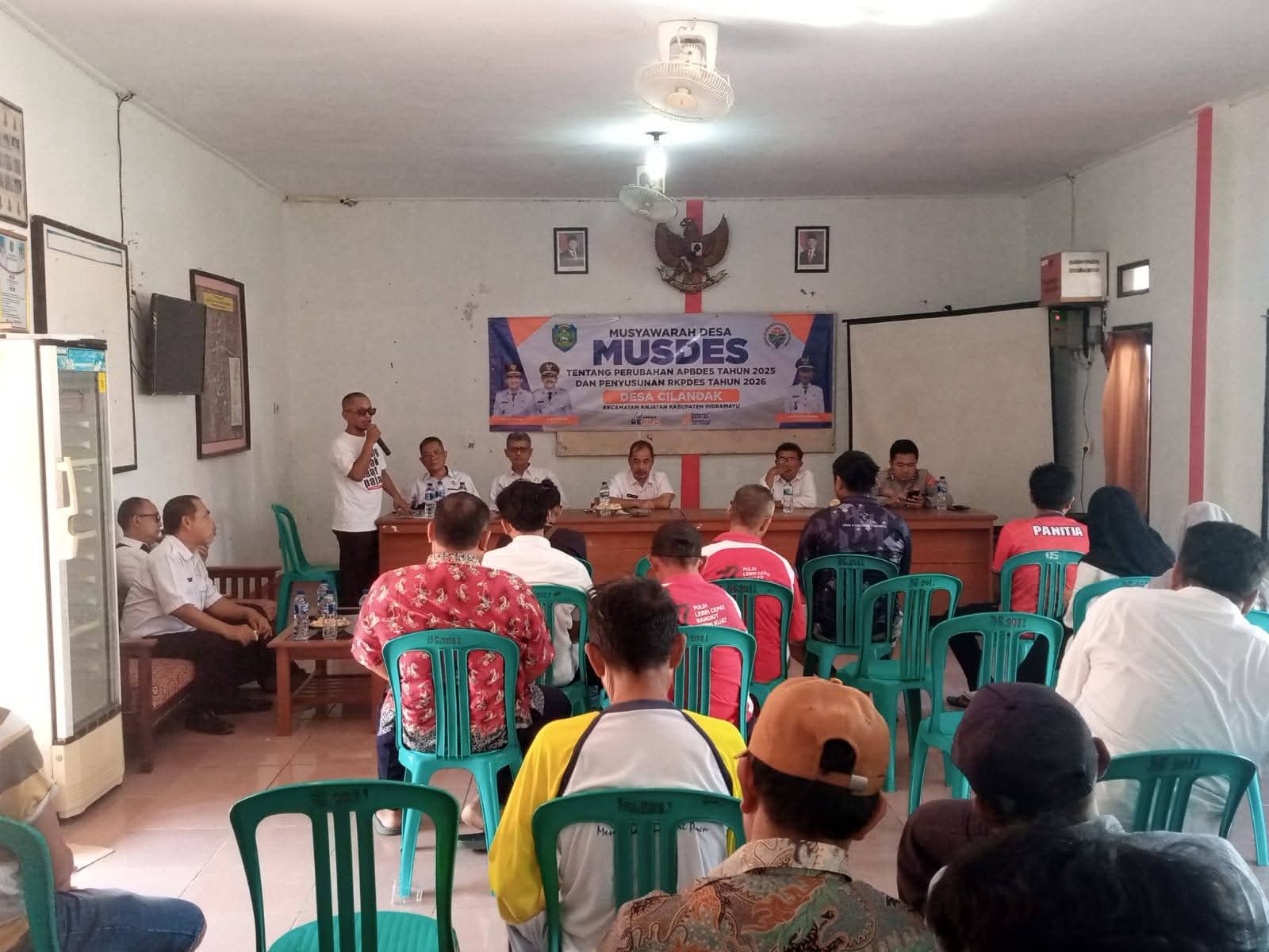 Indramayu – Bhabinkamtibmas Desa Mangunjaya, Polsek Anjatan, Polres Indramayu Polda Jabar, monitoring kegiatan penyampaian informasi pertanggungjawaban realisasi APBDes Semester I Tahun Anggaran 2025 sekaligus Musyawarah Desa (Musdes) Rencana Kerja Pemerintah Desa (RKPDES) Tahun 2026 di Desa Cilandak, Kecamatan Anjatan, Rabu (15/10/2025) pukul 11.00 WIB.