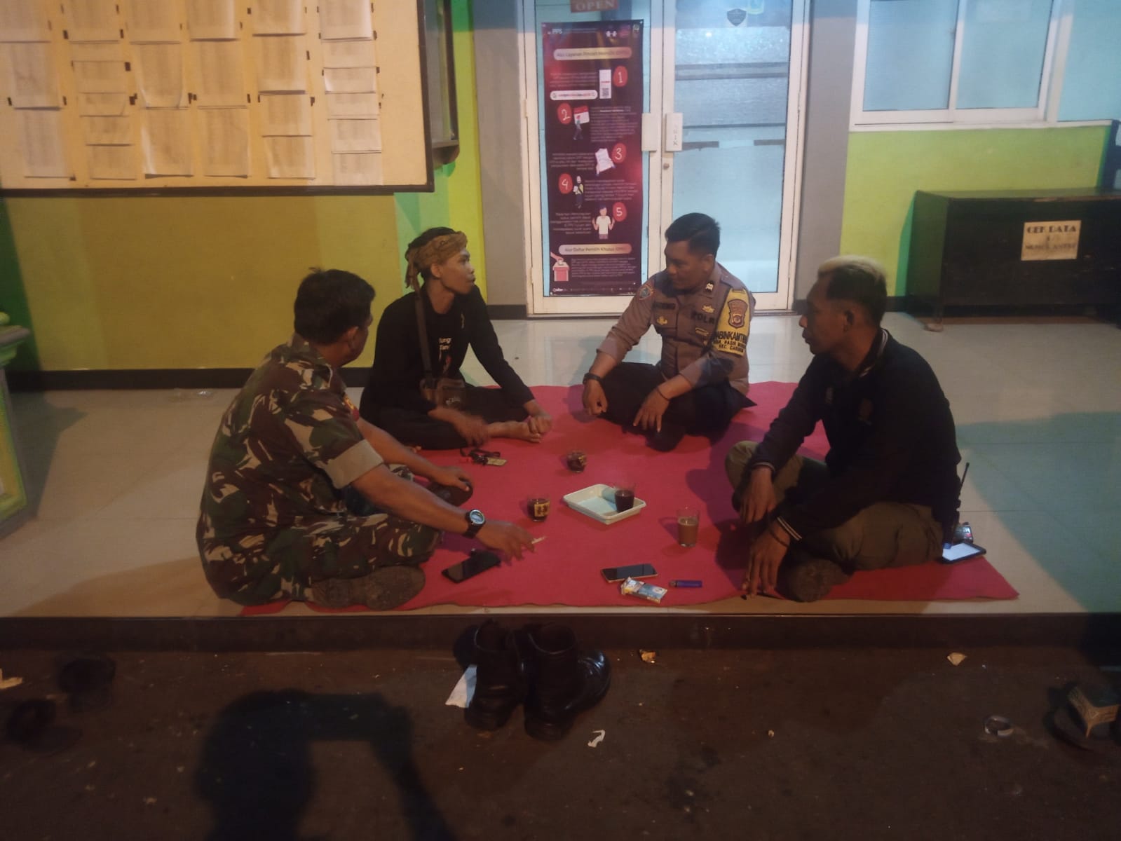 Dalam sambangnya, Bhabinkamtibmas melaksanakan Pengecekan kepada Linmas yg sedang melaksanakan Ronda sekaligus menyampaikan pesan kamtibmas agar meningkatkan kewaspadaan terhadap para tamu dan antisipasi pelaku kejahatan dilingkungannya, Selanjutnya Jika mengetahui sesuatu hal yang mencurigakan atau kejadian menonjol, petugas jaga keamanan agar segera melaporkan kepada pihak Kepolisian,” ujar anggota Bhabinkamtibmas Polsek Caringin Polres Bogor Aiptu Sugeng Purwanto.