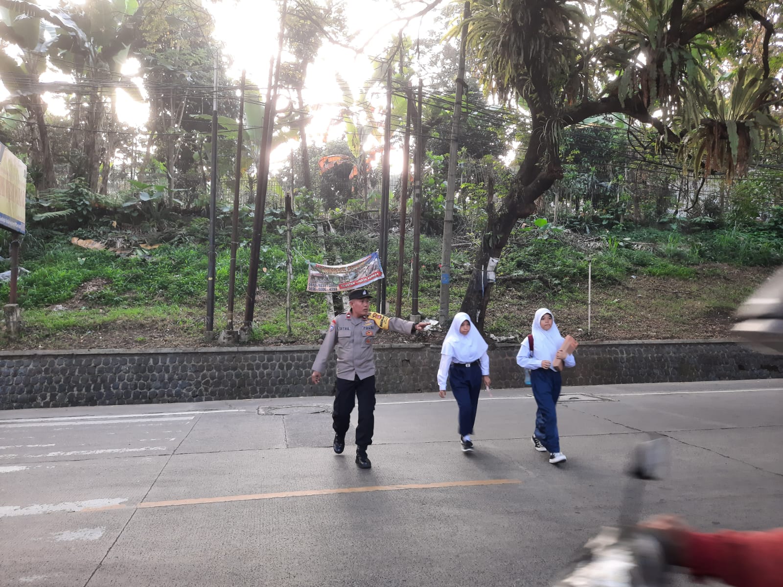 Polda Jabar, Polres Bogor – Bhabinkamtibmas polsek Ciawi Polres Bogor Aipda Sutris melaksanakan Giat Pengaturan lalu lintas pagi disimpang Micio SMPN.2 Ciawi Desa Bitungsari Kec.Ciawi .Kab.Bogor.