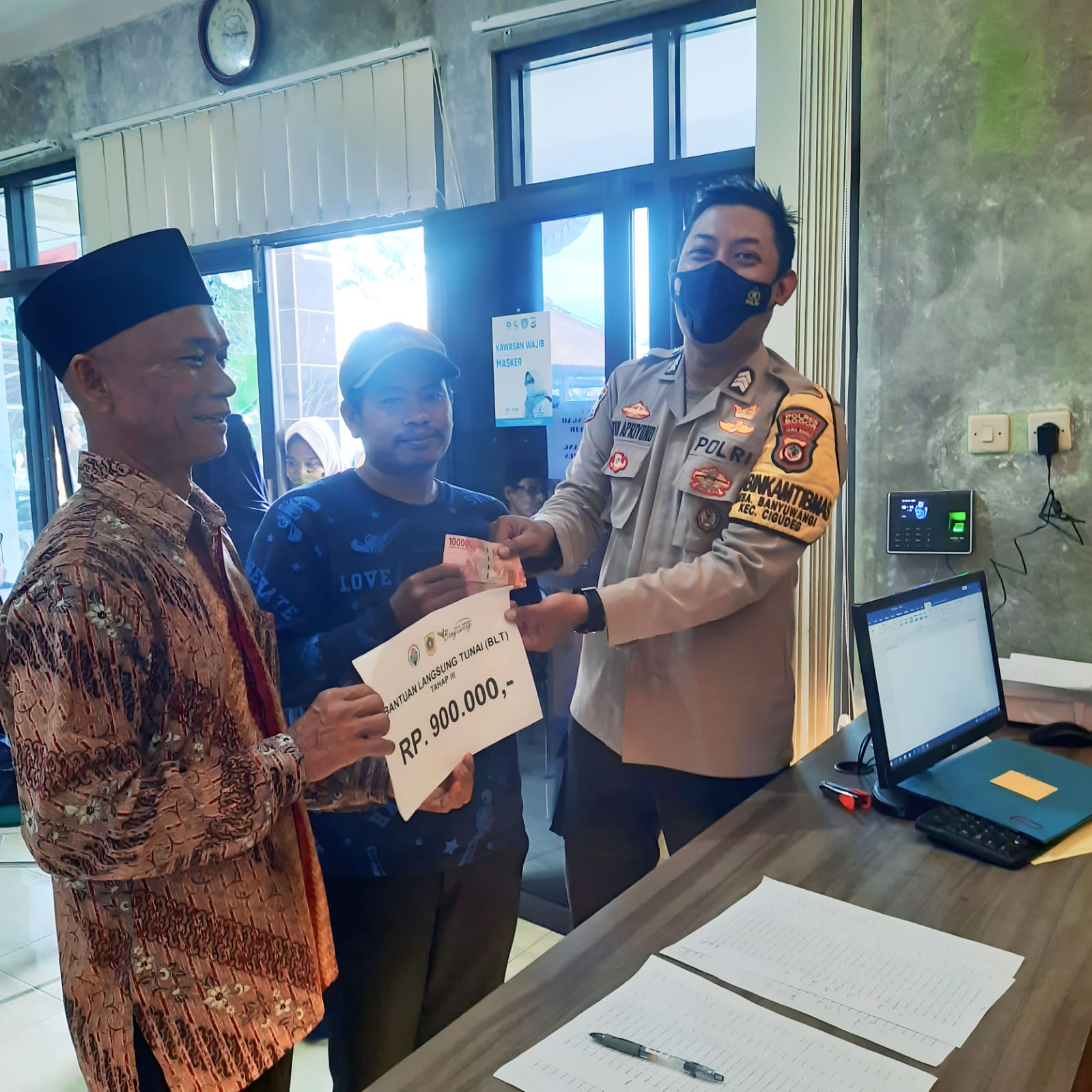 Bhabinkamtibmas Polsek Cigudeg melaksanakan pengamanan Bantuan untuk warga masyarakat di Kantor Desa.