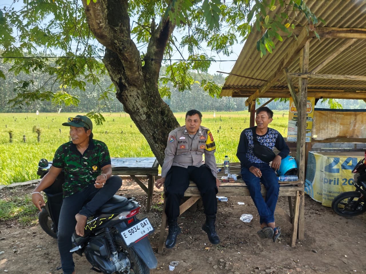 Indramayu, — Suasana akrab terlihat di bawah rimbunnya pepohonan yang tumbuh di tepi sawah Desa Sanca, Kecamatan Gantar.