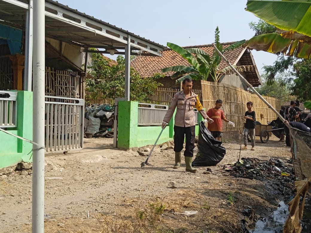 Bhabinkamtibmas Polsek Krangkeng Gotong Royong Bersihkan Lingkungan di Desa Kalianyar