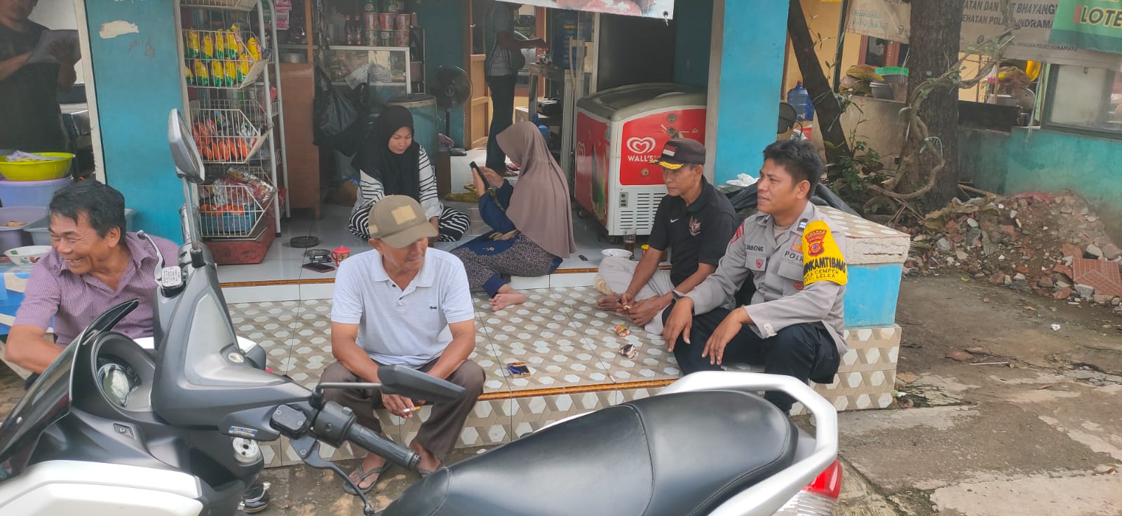 AIPTU Limbong tampak duduk santai bersama warga di depan sebuah warung, berdialog dan menyampaikan pesan-pesan kamtibmas secara langsung dan humanis.