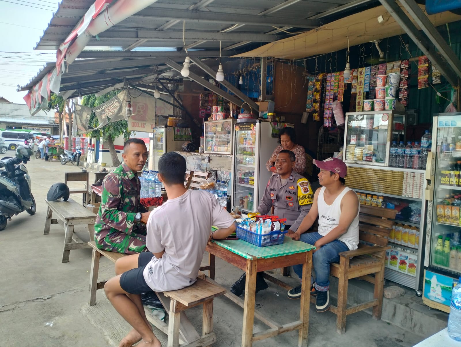 Bhabinkamtibmas Polsek Lohbener Polres Indramayu Polda Jabar AIPTU Wahyu bersama PELTU Tamin dari Koramil Lohbener melaksanakan sambang warga di sebuah warung, sambil menyampaikan pesan-pesan kamtibmas.