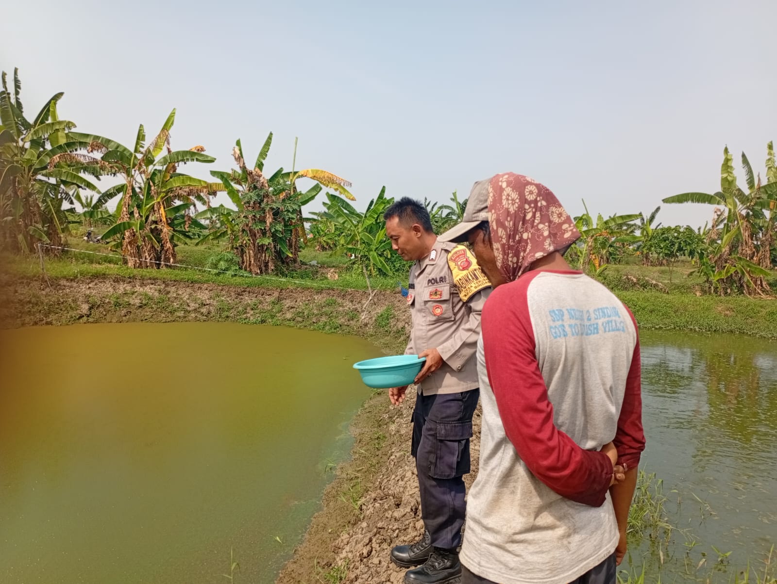 Bhabinkamtibmas Desa Terusan, AIPDA Herru, terlihat menyambangi lahan tambak milik Jajat di Blok Cidedel, RT 24 RW 08, Desa Terusan, Kecamatan Sindang, Kabupaten Indramayu.