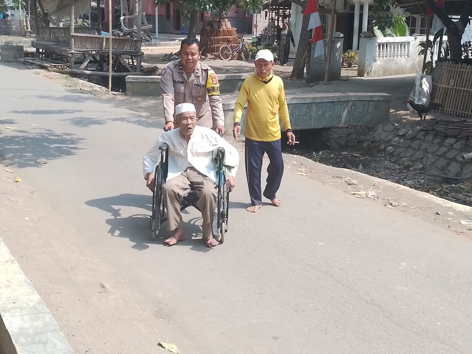 Indramayu, – Aipda Solehudin, Bhabinkamtibmas Desa Panyindangan Kulon Polsek Sindang jajaran Polres Indramayu Polda Jabar, memberikan pertolongan kepada seorang tokoh masyarakat bernama Bapak Dani yang mengalami kesulitan berjalan.