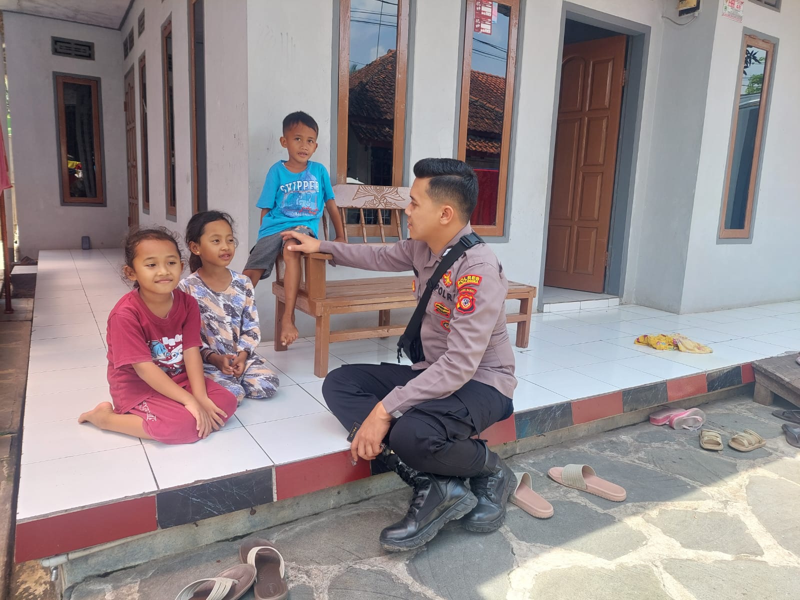 Majalengka – Bhabinkamtibmas Polsek Sukahaji dari Polres Majalengka Polda Jabar, Briptu Rudianto, melaksanakan kegiatan sambang dan dialogis dengan anak-anak warga yang sedang bermain di salah satu rumah warga di wilayah Desa Palabuan, Kecamatan Sukahaji, Kabupaten Majalengka, pada Jumat (29/9/2023).
