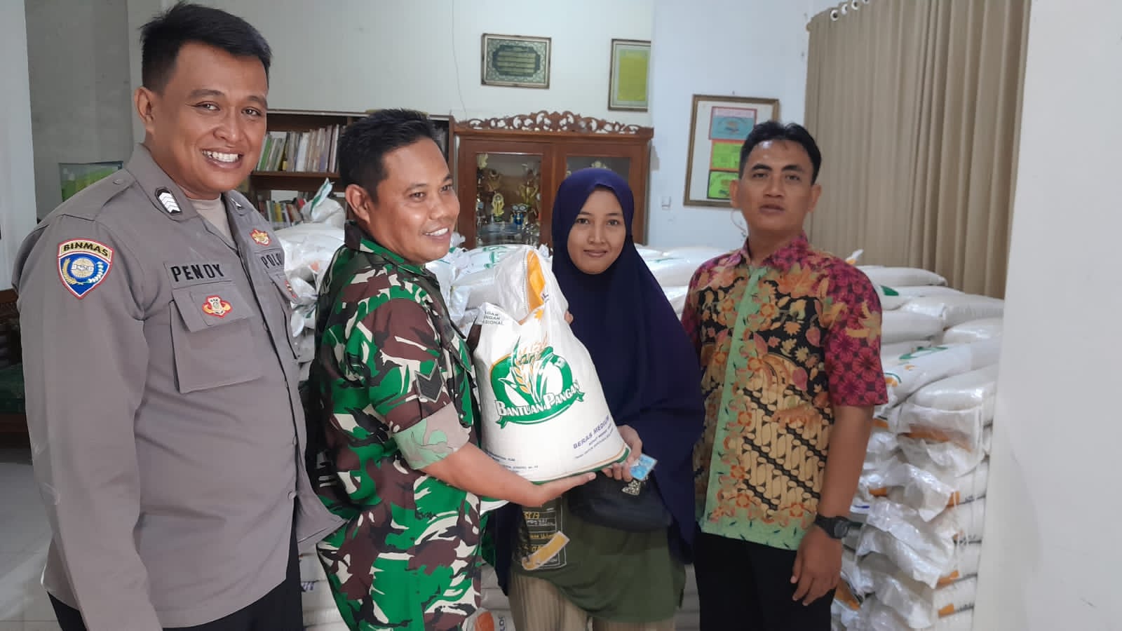 Bhabinkamtibmas Kelurahan Kejaksan Bripka Pendy Tristiyanto, SH melakukan Pengamanan dan Pemantauan Penyaluran Penerimaan Bantuan Pangan Tahun 2023 berupa pembagian Beras bagi warga masyarakat tidak mampu di Kelurahan Kejaksan Kecamatan Kejaksan, Wilkum Polres Cirebon Kota.