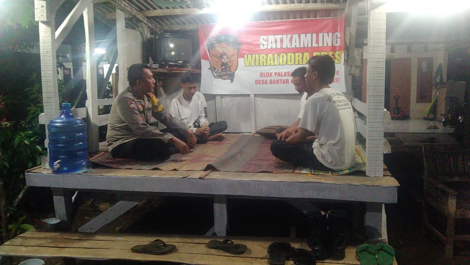 Indramayu- Bhabinkamtibmas Polsek Gantar jajaran Polres Indramayu Polda Jabar, melakukan kegiatan sambang ke Pos Satuan Keamanan dan Ketertiban Masyarakat Lingkungan (Pos Satkamling) di Desa Gantar, Kecamatan Gantar, Kabupaten Indramayu, Sabtu (21/10/2023) malam.