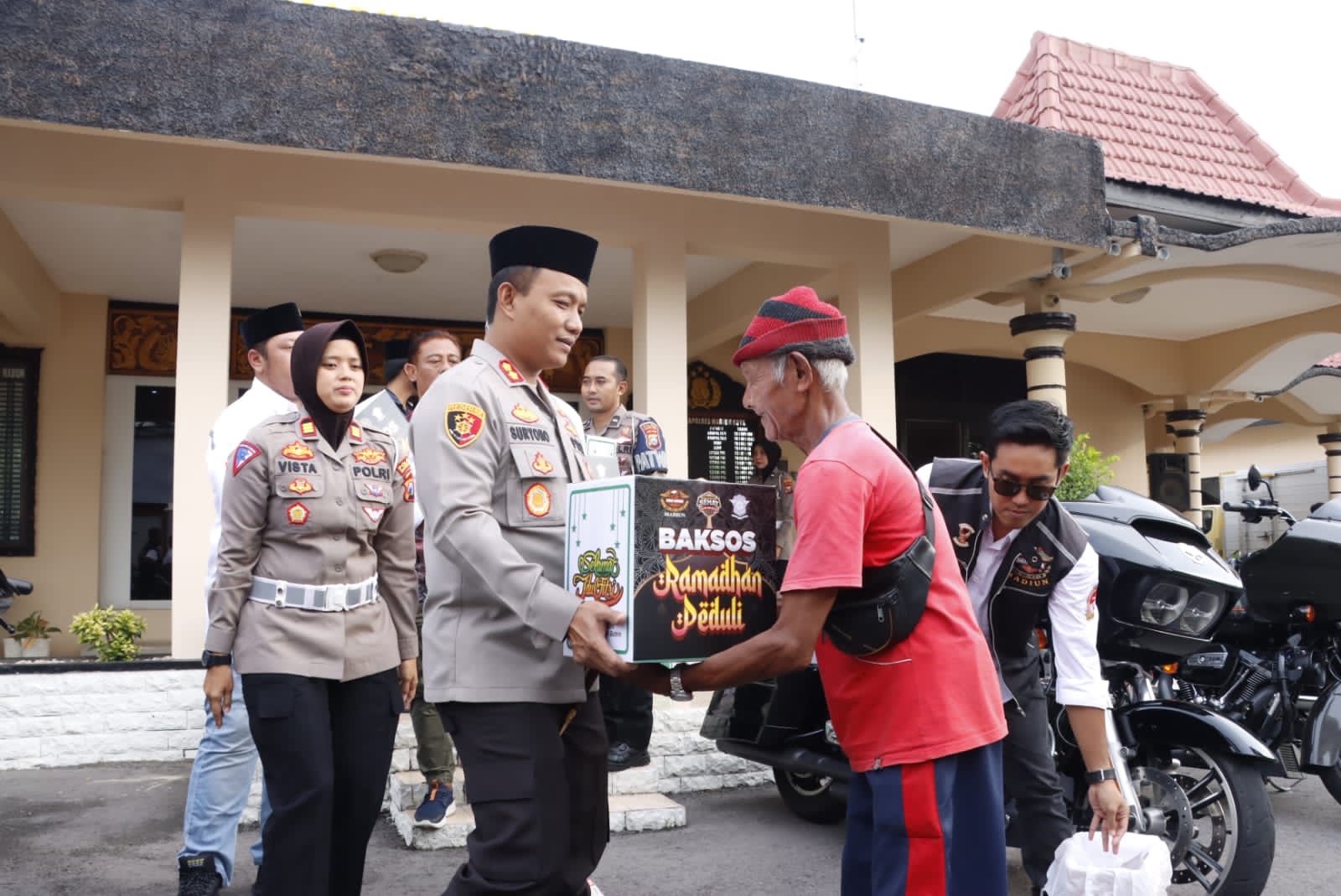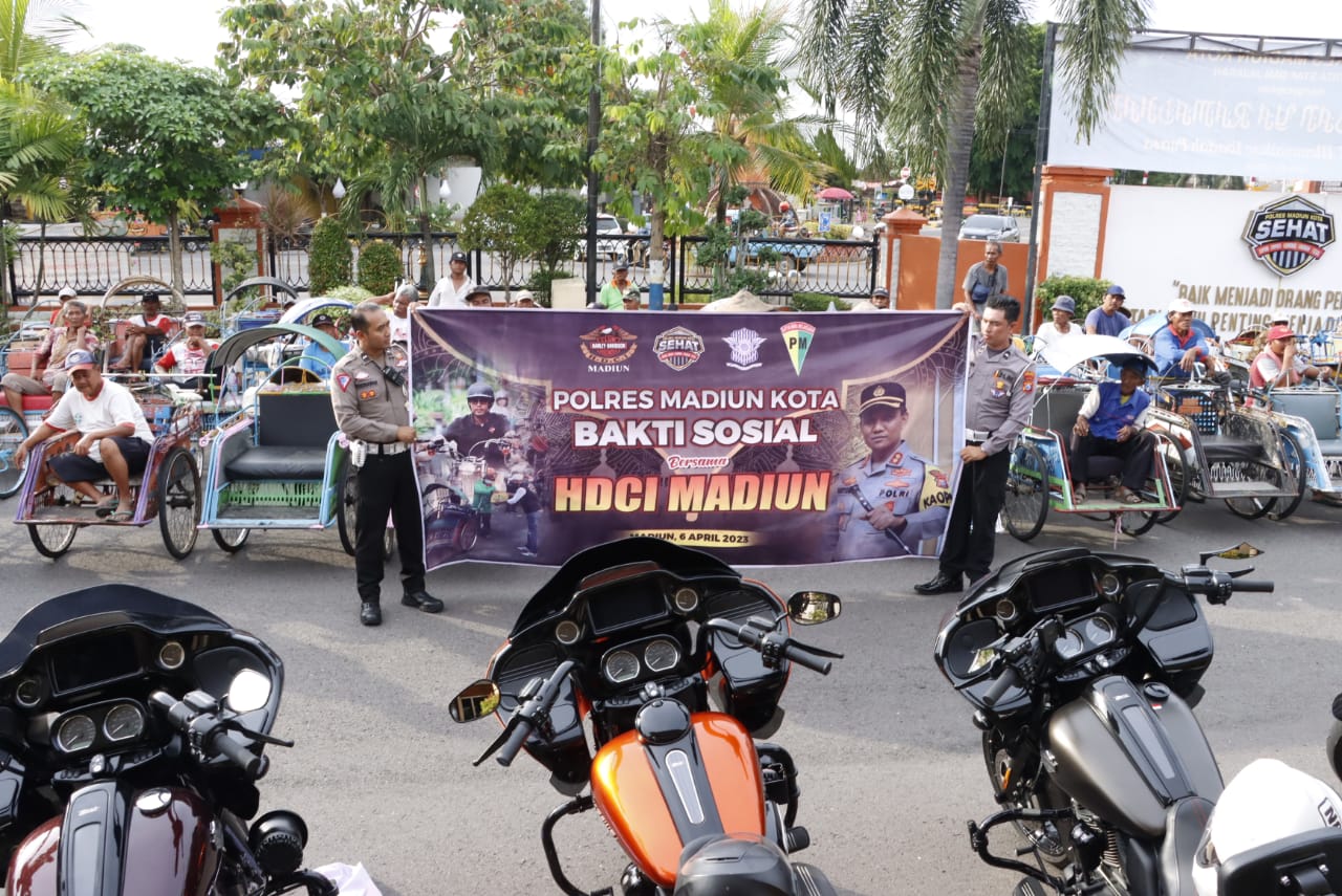 Kota Madiun,MATAMAJA GROUP — Polres Madiun Kota bersama Komunitas motor Harley Davidson Club’ Indonesia (HDCI Madiun) menggelar bakti sosial Ramadhan 1444 H di depan Mako Polres, Jum’at (7/4/2023) menjelang buka puasa.