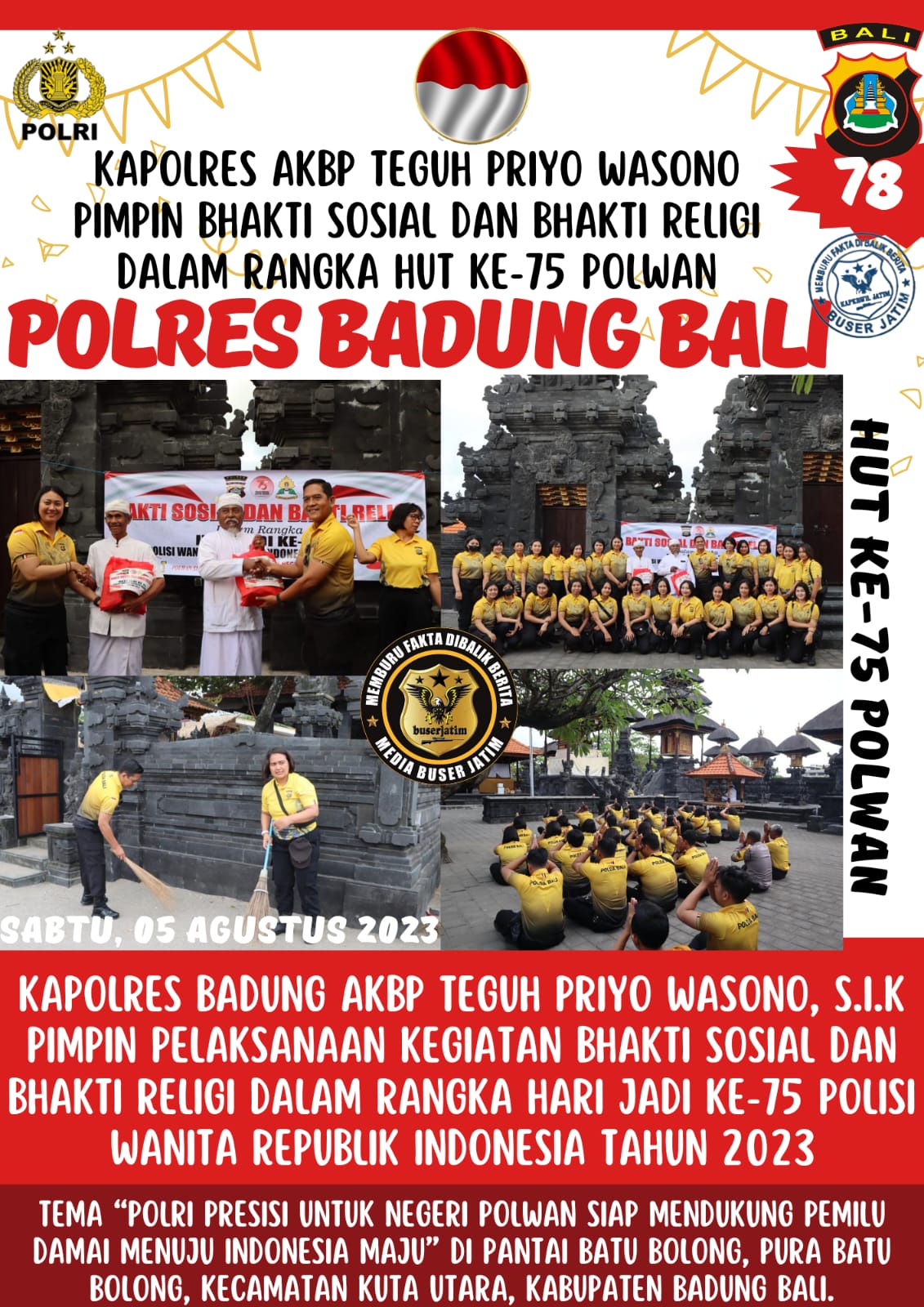 BUSERJATIM.COM || MANGUPURA BADUNG BALI – Kapolres Badung AKBP Teguh Priyo Wasono, S.I.K pimpin pelaksanaan kegiatan Bhakti Sosial dan Bhakti religi dalam rangka Hari Jadi ke-75 Polisi Wanita Republik Indonesia Tahun 2023 dengan tema “Polri Presisi Untuk Negeri Polwan Siap Mendukung Pemilu Damai menuju Indonesia Maju” di Pantai Batu Bolong, Pura Batu Bolong, Kecamatan Kuta Utara, Kabupaten Badung Bali. Sabtu, 5 Agustus 2023 Pukul 07.30 Wita.