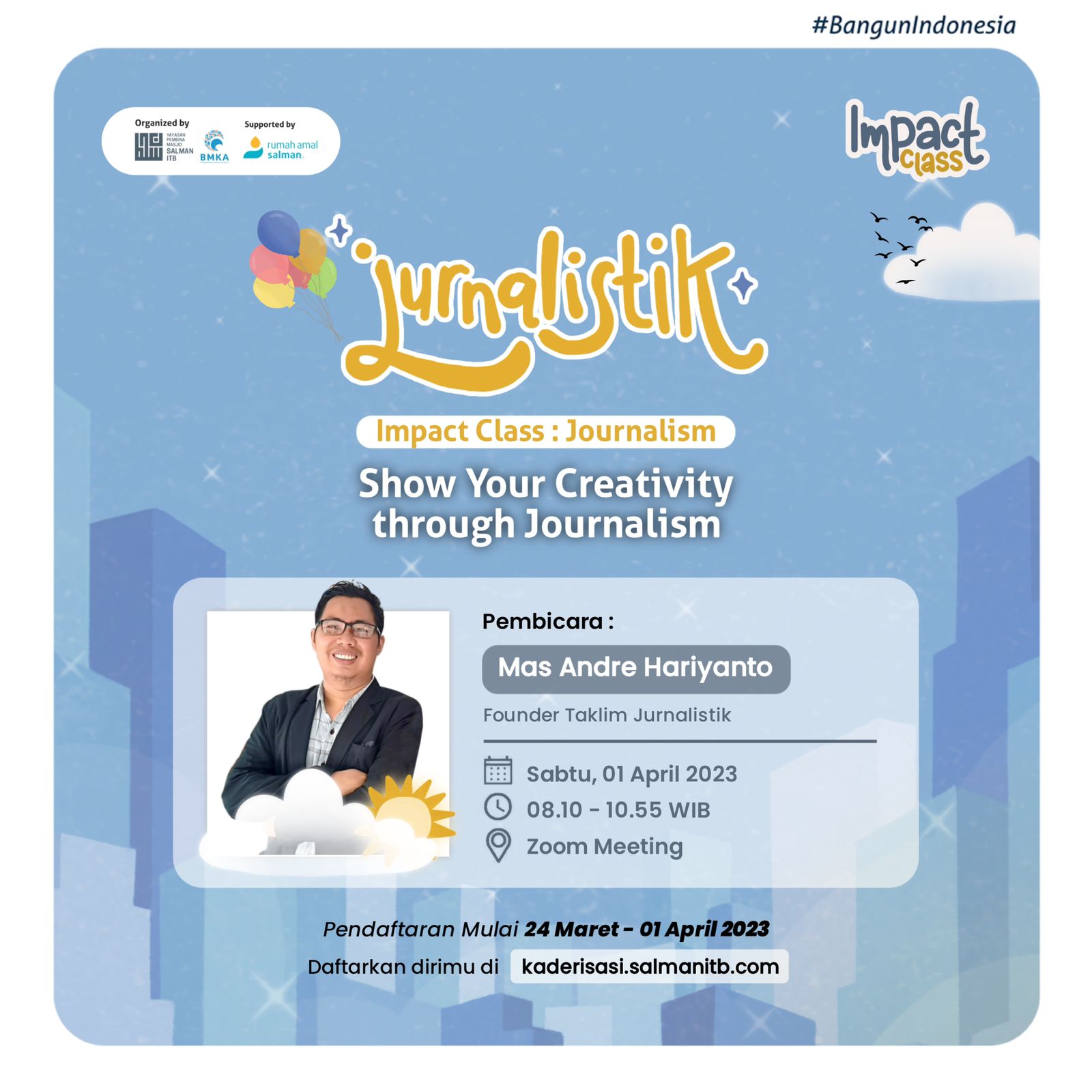 Kegiatan yang bertajuk “Show Your Creativity through Journalism” akan dipandu oleh Mas Andre Hariyanto seorang Wartawan muda yang berpengalaman, Aktivis dan Master trainer AR Learning Center dari Daerah Istimewa Yogyakarta (D.I. Yogyakarta).
