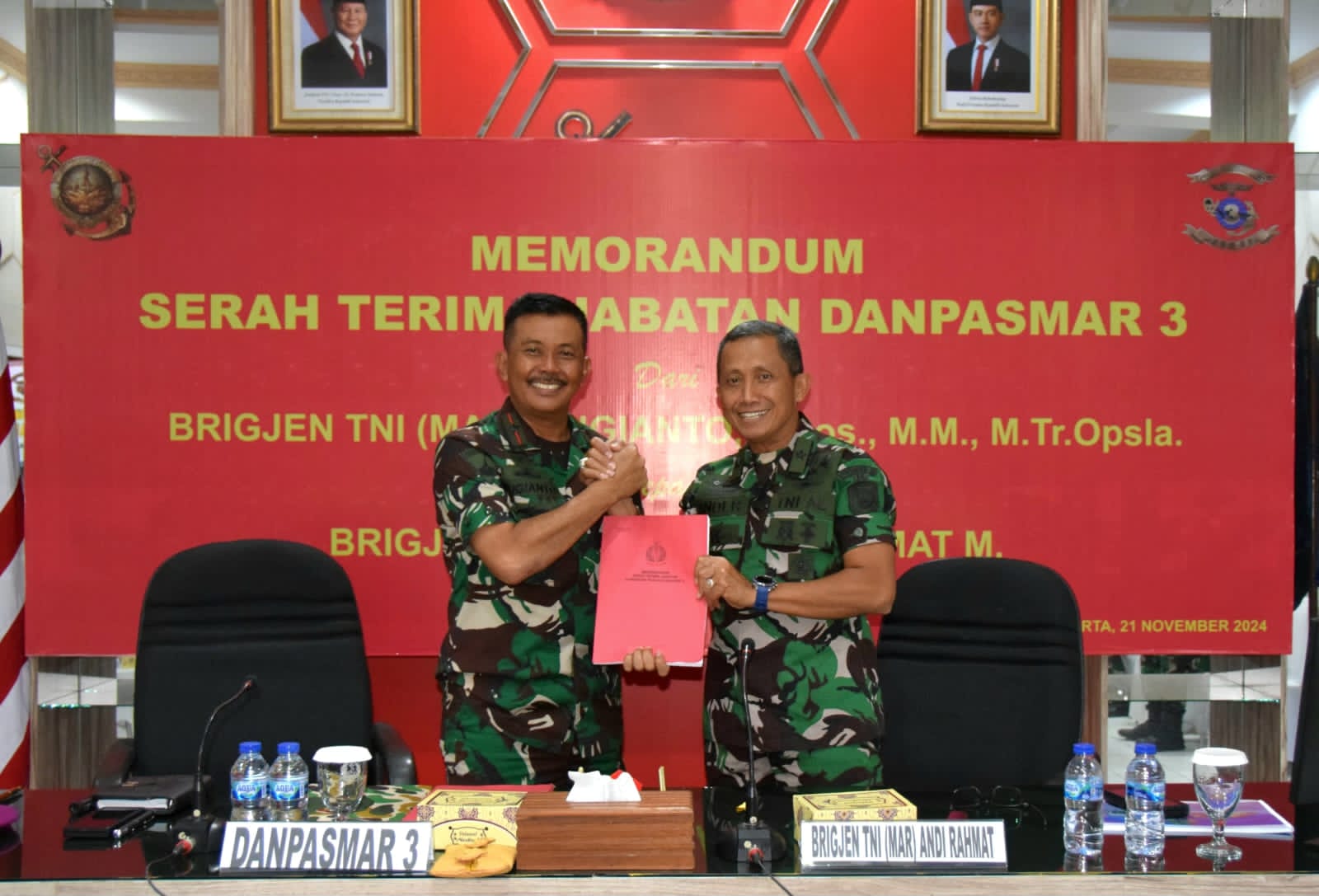 JAKARTA, BUSERJATIM.COM GROUP – Brigjen TNI (Mar) Sugianto, S.Sos., M.M., M.Tr.Opsla., secara resmi menyerahkan Memorandum pelaksanaan tugas di jajaran Pasmar 3 kepada Brigjen TNI (Mar) Andi Rahmat M bertempat di ruang rapat Mako Brigif 1 Marinir, Kesatrian Hartono, Cilandak, Jakarta Selatan. Kamis (21/11/24).
