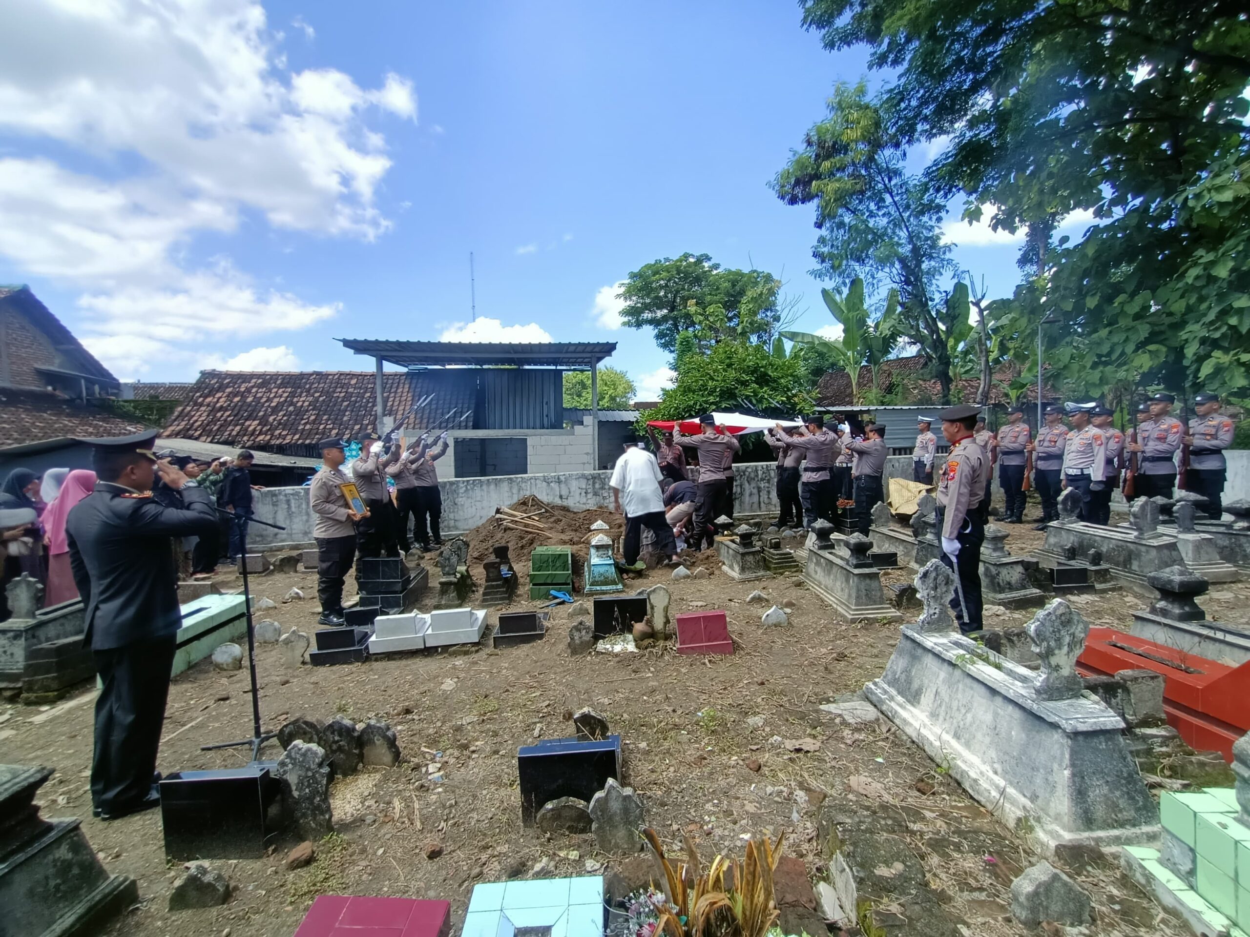 Upacara pemakaman berlangsung dengan penuh hikmat. Suara tembakan salvo penghormatan terdengar mengiringi prosesi pemakaman, diiringi isak tangis keluarga dan pelayat yang hadir. Jenazah almarhum akhirnya dimakamkan dengan upacara kedinasan sebagai bentuk penghormatan atas jasa dan pengabdiannya dalam menjaga keamanan dan ketertiban masyarakat.