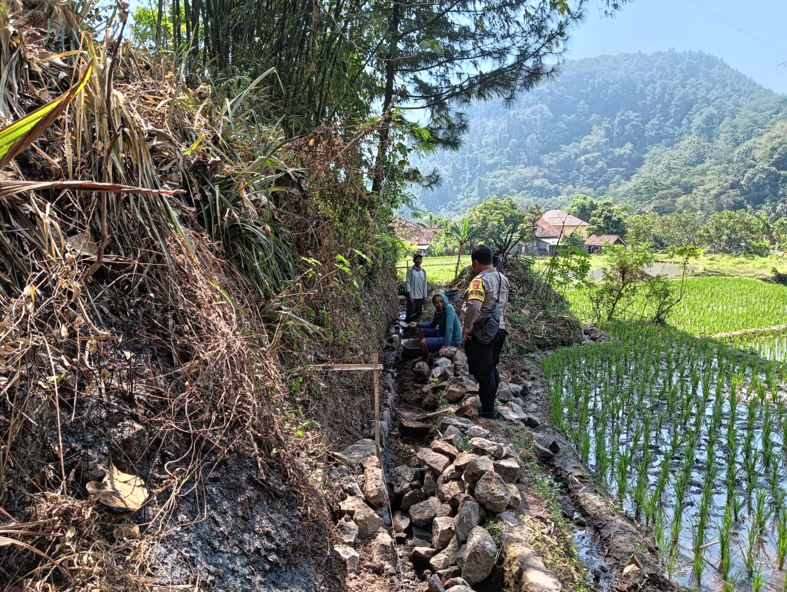 Bripka Deni Mardiansyah melakukan pemantauan langsung terhadap pengerjaan proyek irigasi yang sedang berlangsung di Desa Lengkong Wetan, Kecamatan Sindangwangi, Kabupaten Majalengka.