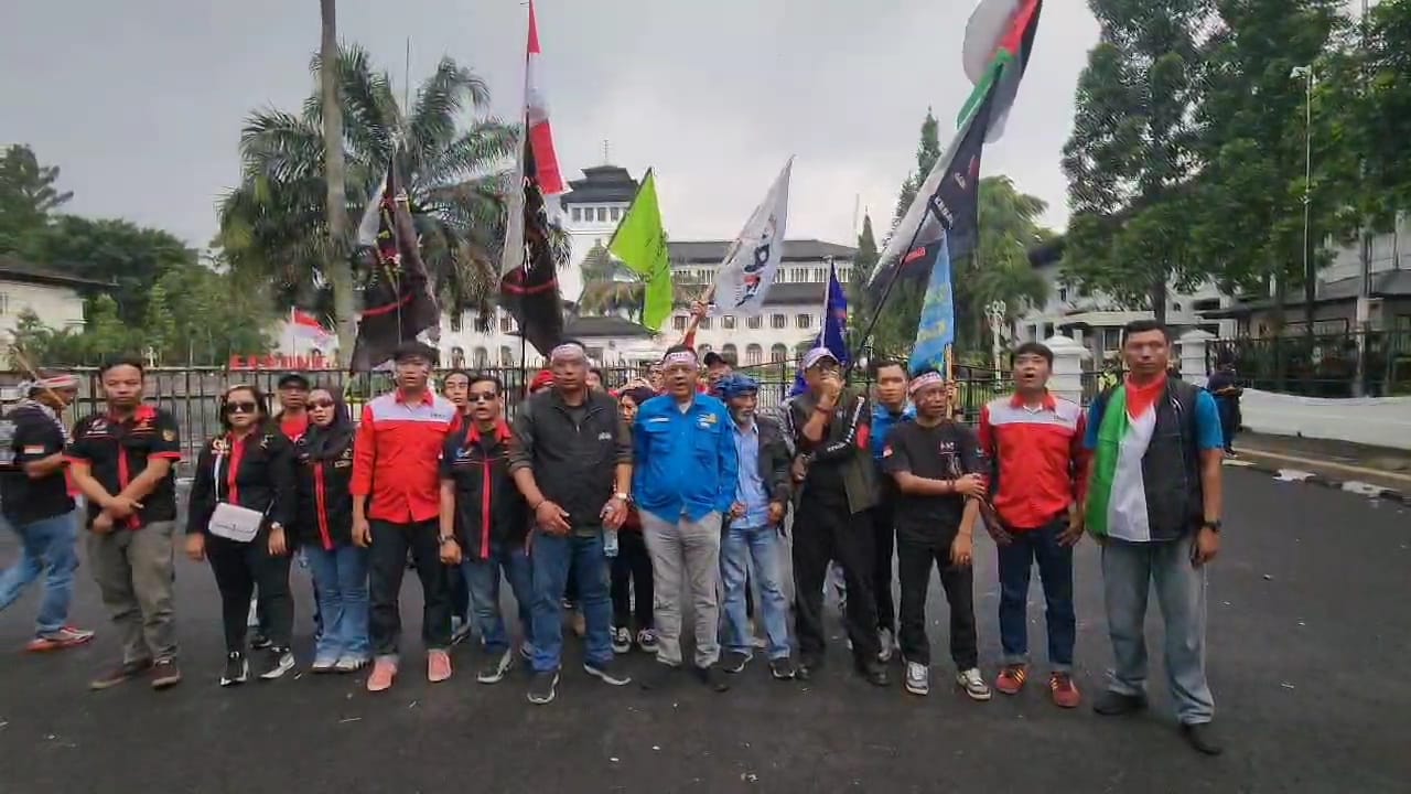 Bandung – Elemen buruh yang tergabung dalam Forum Urun Rembug Jabar gelar aksi solidaritas Nela Palestina di Gedung Sate Kota Bandung, Jum’at tanggal 10 Oktober 2025