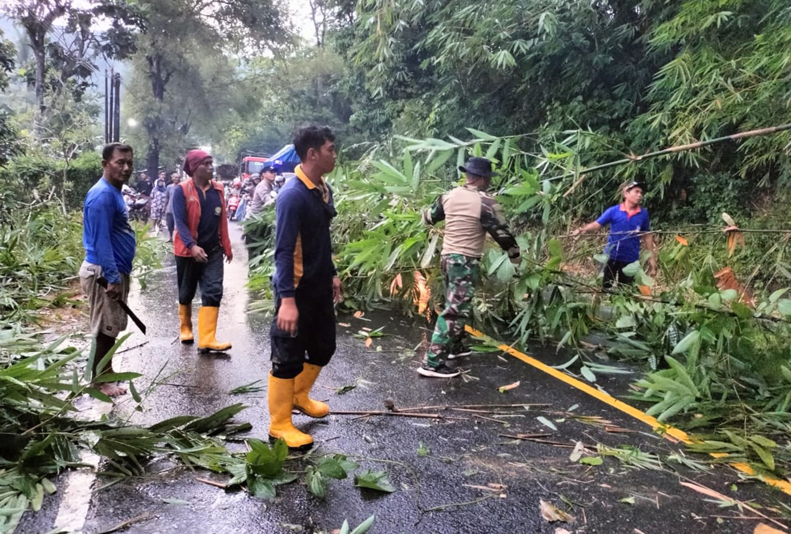 Respon Cepat TNI-Polri dan BPBD Trenggalek Singkirkan Rumpun Bambu yang Menutup Jalan Nasional