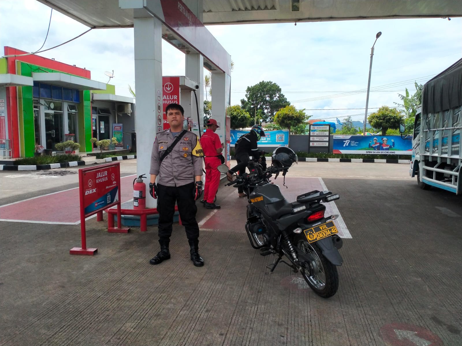 Majalengka – Bhabinkamtibmas Polsek Cikijing Polres Majalengka Polda Jabar, Bripka Harry dan Bripka Kurdiyanto melakukan Pengamanan dan monitoring di SPBU Cikijing Kabupaten Majalengka, Minggu (27/08/2023).