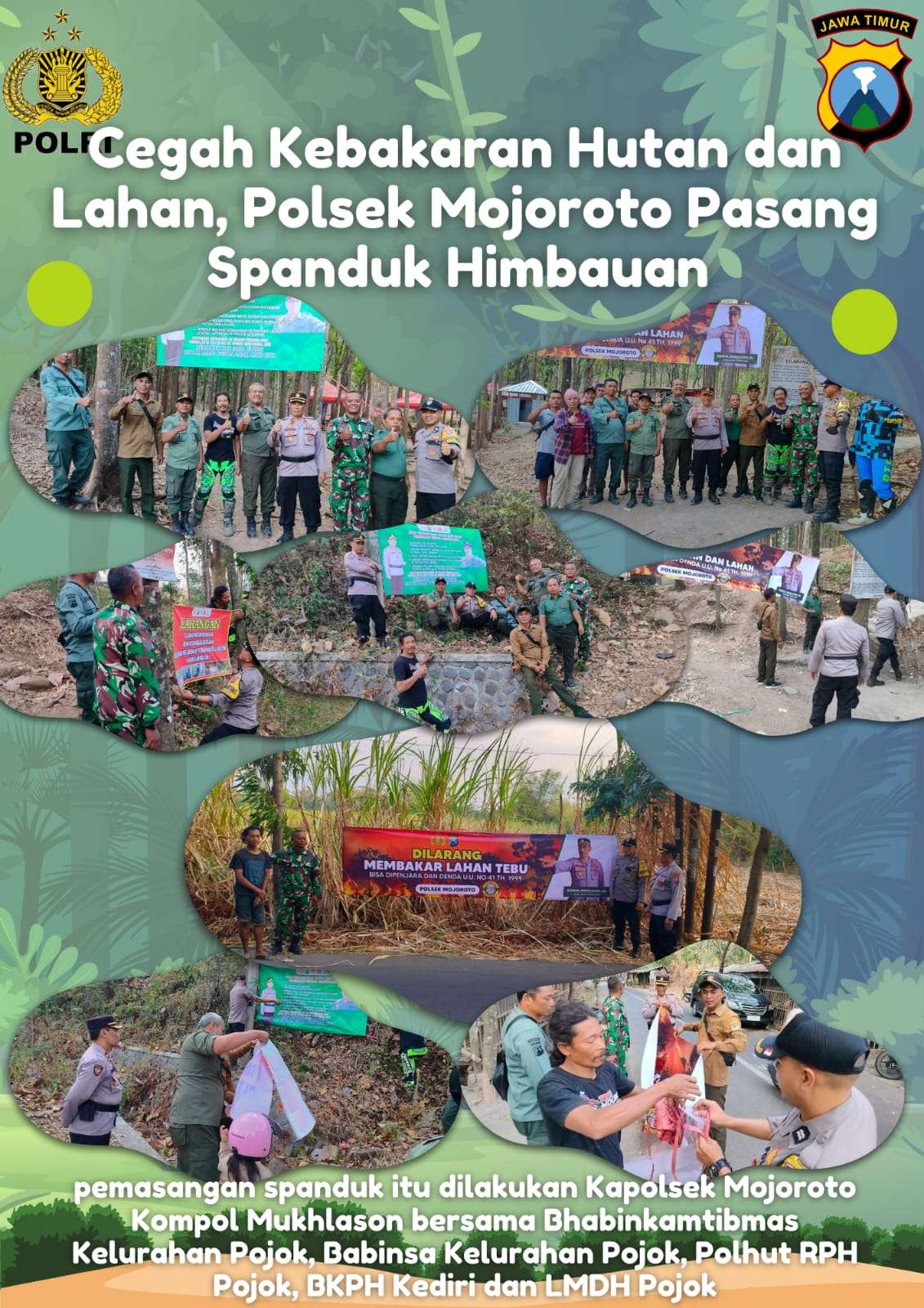 Dalam pelaksanaannya, pemasangan spanduk itu dilakukan Kapolsek Mojoroto Kompol Mukhlason bersama Bhabinkamtibmas Kelurahan Pojok, Babinsa Kelurahan Pojok, Polhut RPH Pojok, BKPH Kediri dan LMDH Pojok.