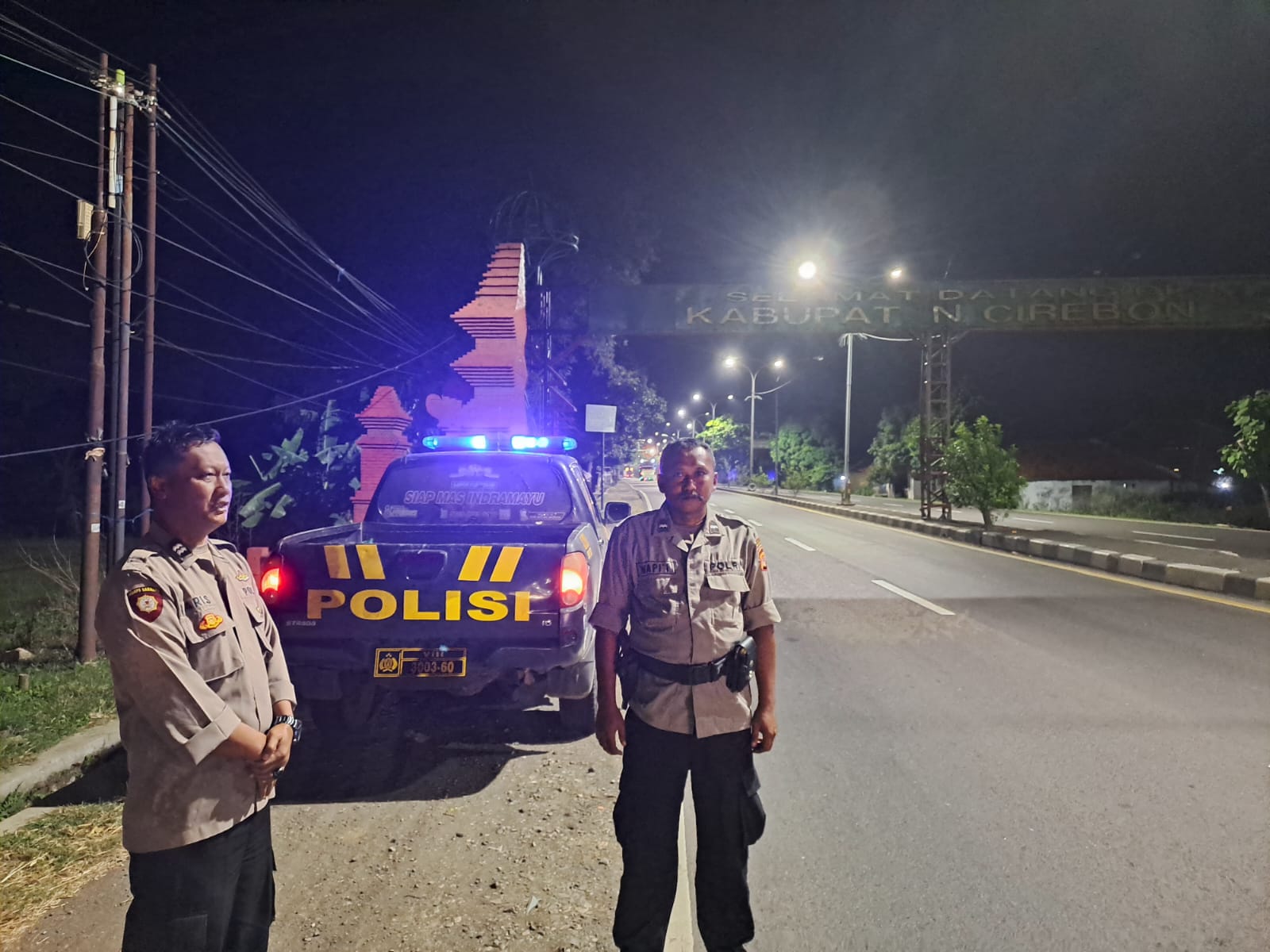 Indramayu – Dua personel Polsek Sukagumiwang, Polres Indramayu jajaran Polda Jabar tampak siaga berjaga di jalur utama perbatasan Kabupaten Indramayu dengan Kabupaten Cirebon, Kamis (18/7/2025) dini hari.