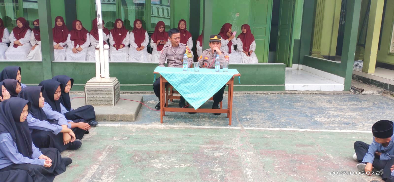 Pada kesempatan ini Panit Binmas Polsek Cikijing Polres Majalengka Polda Jabar IPDA Brigmono R, S.H bersama Bhabinkamtibmas Bripka Achmad Supriyono memberikan pembinaan dan penyuluhan mengenai kenakalan remaja dan aksi bullying di MTs PUI Cikijing, Kecamatan Cikijing, Kabupaten Majalengka, Sabtu (07/10/2023).