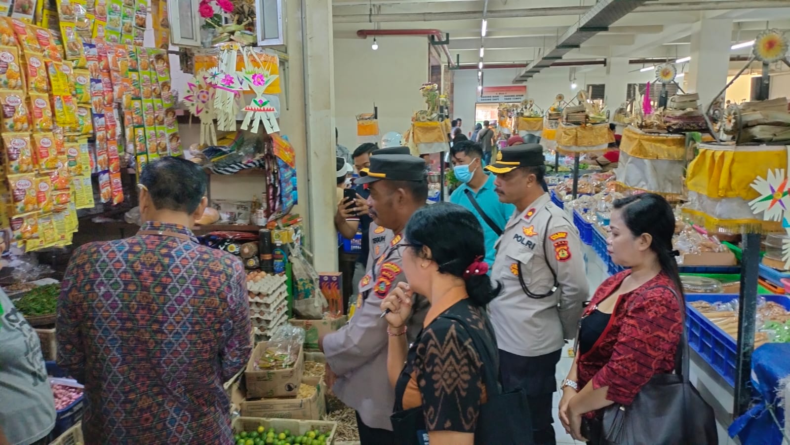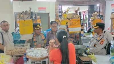 Kapolres Badung AKBP Teguh Priyo Wasono, S.I.K., didampingi Kapolsek Abiansemal Kompol I Gusti Made Sudarma Putra, S.Sos., S.H., M.A.P., blusukan ke Pasar Blahkiuh untuk cek kestabilan harga sembako di Kecamatan Abiansemal, Badung, daerah hukum Polres Badung, Jumat (18/08/2023) pagi.