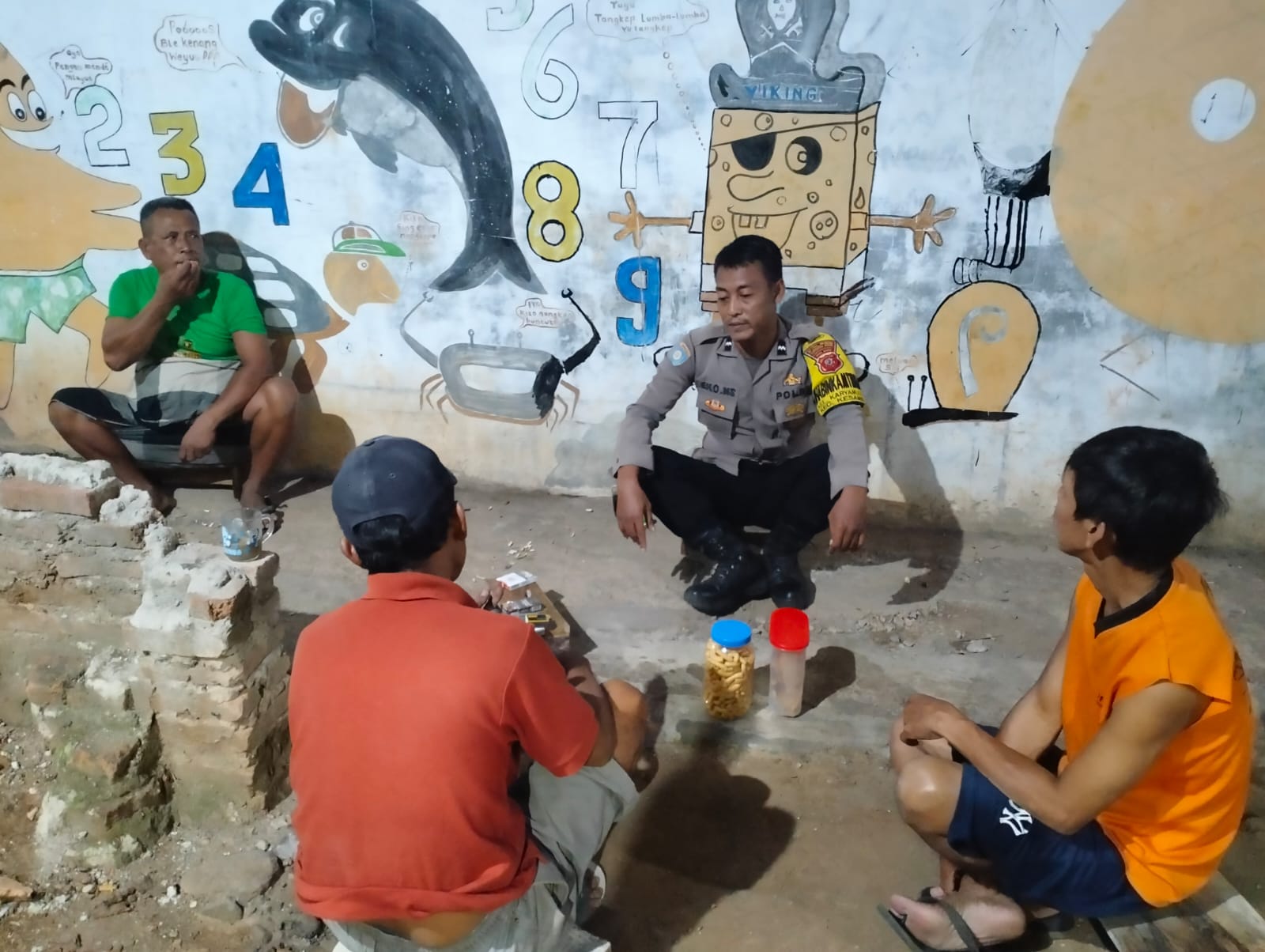 Bhabinkamtibmas Kelurahan karya Mulya Aipda Eko , menyatu bersama warga RW 09 harapan mulyad melalui sambang patroli warga binaan ajak jaga kerukunan pasca Pemilu 2024 , Kamis malam (20/06/2024).