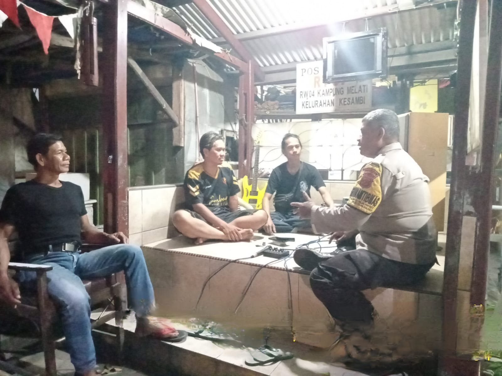 POLRES CIREBON KOTA -, Pantau siskamling, Bhabinkamtibmas kelurahan kesambi Polsek kesambi Polres Cirebon kota Aiptu Ade Wardaya sambang poskamling RW 07 kampung melati kelurahan kesambi memberikan edukasi Kamtibmas, Minggu malam (14/07/2024)