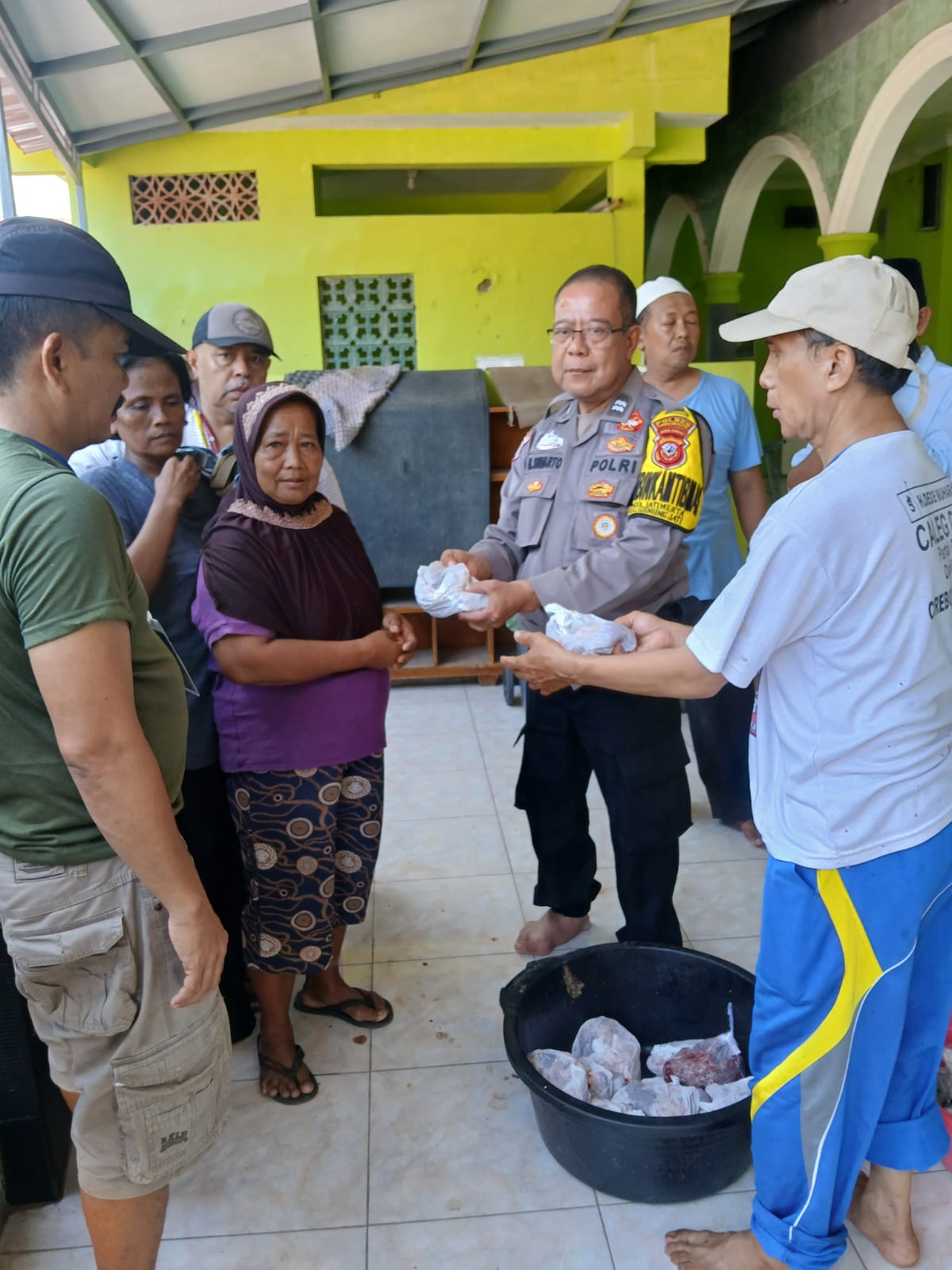 Bhabinkamtibmas Jatimera sambangi distribusi daging qurban hari raya idul Adha 1445 H di RW 03 Jatimert menghimbau jaga kondusifitas Selasa (18/06/2024).