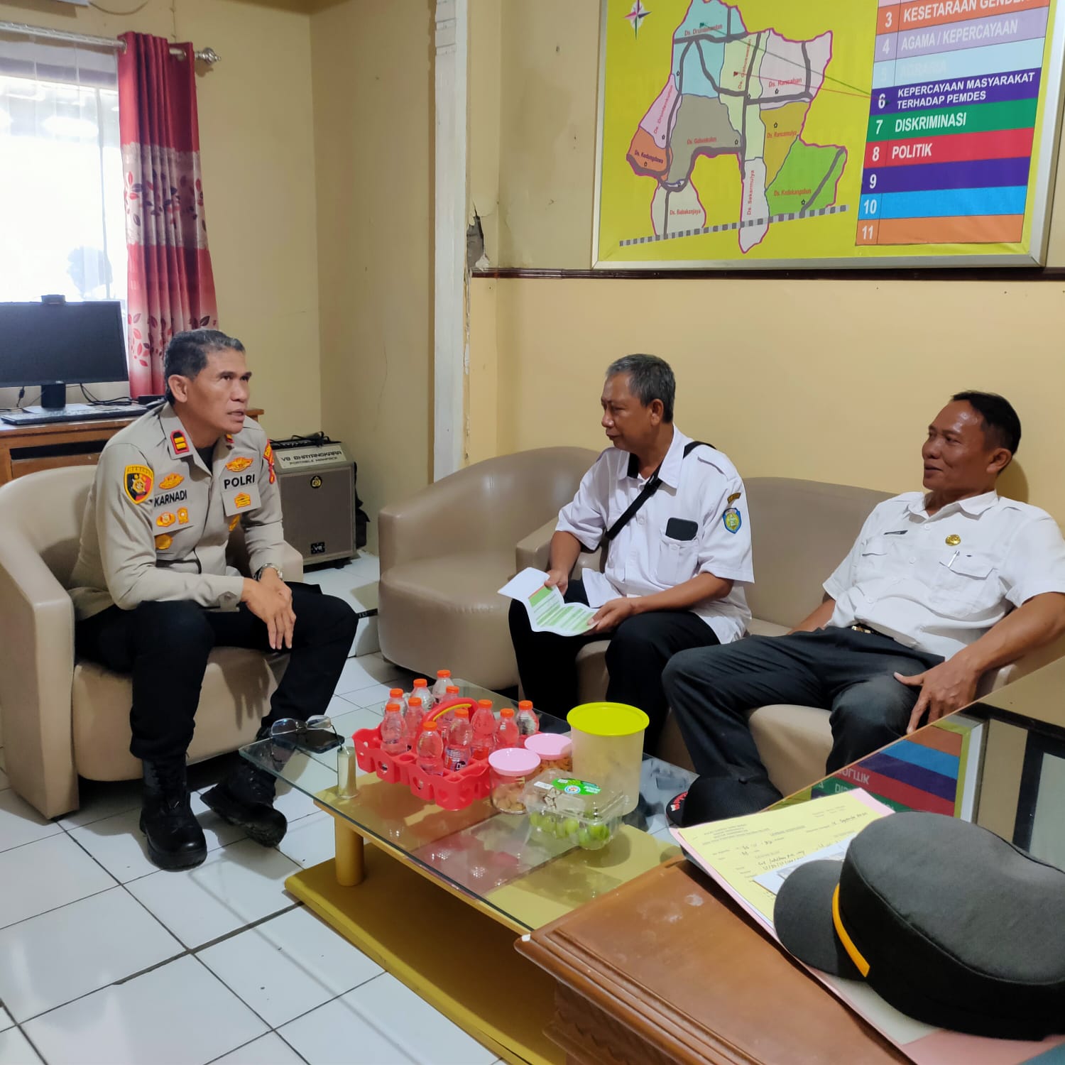 Dalam kunjungannya, IPTU H. Karnadi Setiawan berdialog dengan para tokoh masyarakat untuk memberikan himbauan terkait pentingnya menjaga perdamaian dan keamanan di lingkungan masing-masing.