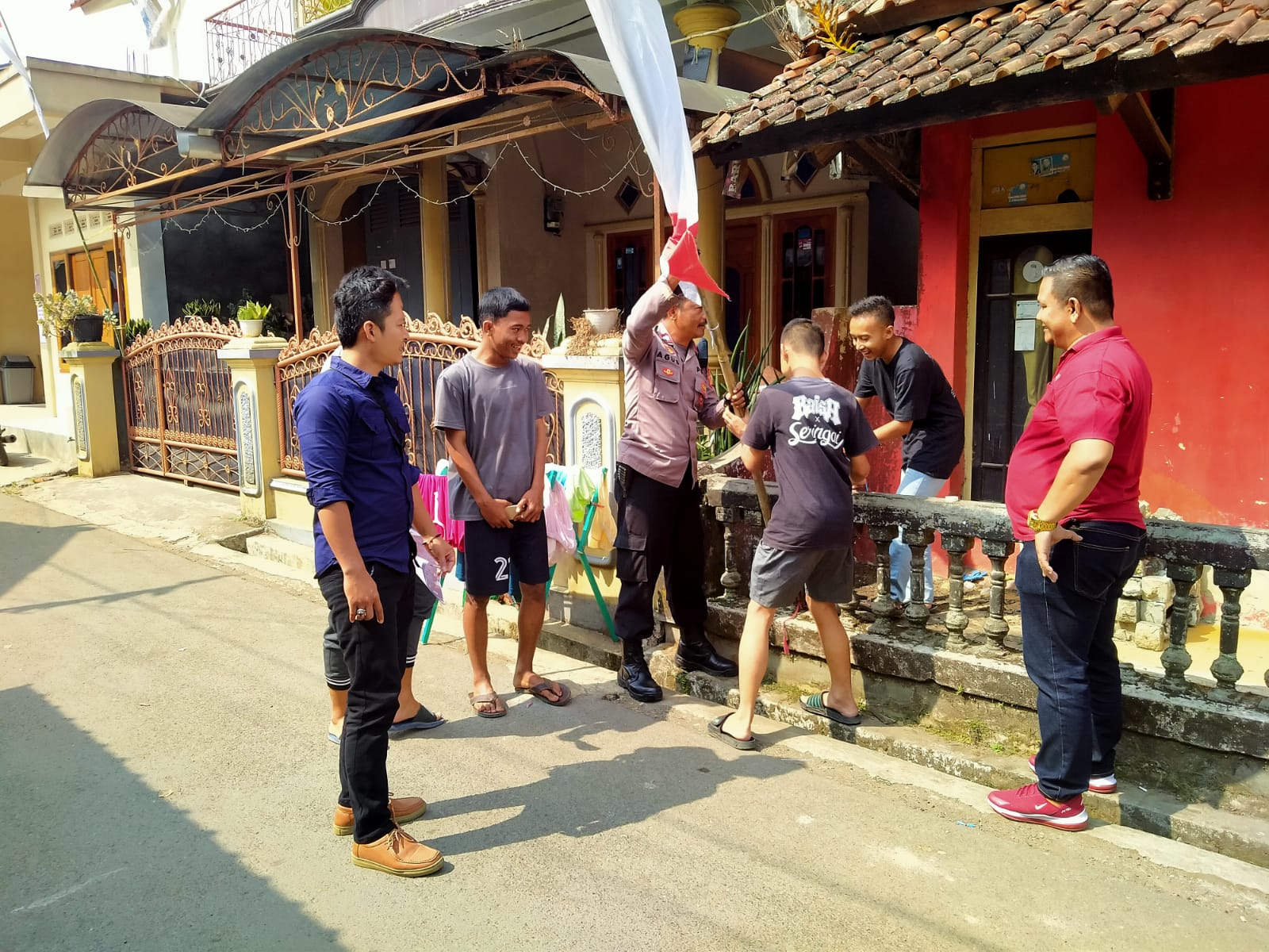 Seperti yang dilakukan dalam kegiatan sambangnya Personil Polsek Cikijing terlihat bersama warga memasang bendera merah putih dan umbul umbul di depan rumah warga.