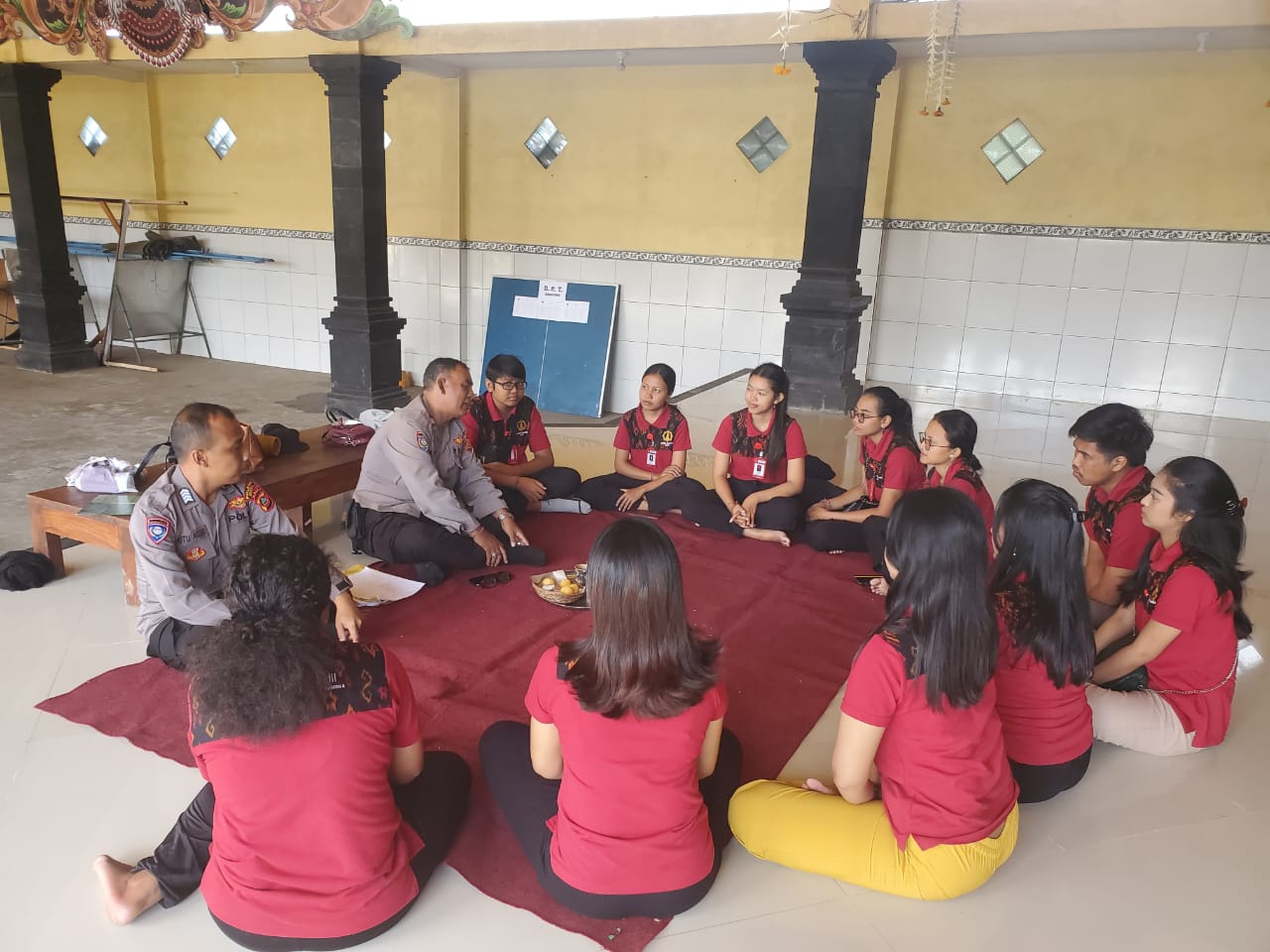 Dalam upaya pemeliharaan situasi Kamtibmasdi wilayah hukum Polres Bangli guna terciptanya situasi kamtibmas yang aman dan kondusif guna terselengaranya pembangunan di semua lini serta di semua, sendi kehidupan tentunya diharapkan kesadaran dan peran Serta seluruh lapisan masyarakat dan peran aktif potensi masyarakat maka Satbinmas Polres Bangli Laksanakan Binluh guna sampaikan pesan Kamtibmas dengan menyasar Mahasiswa yang melaksanakan kuliah kerja nyata (KKN).