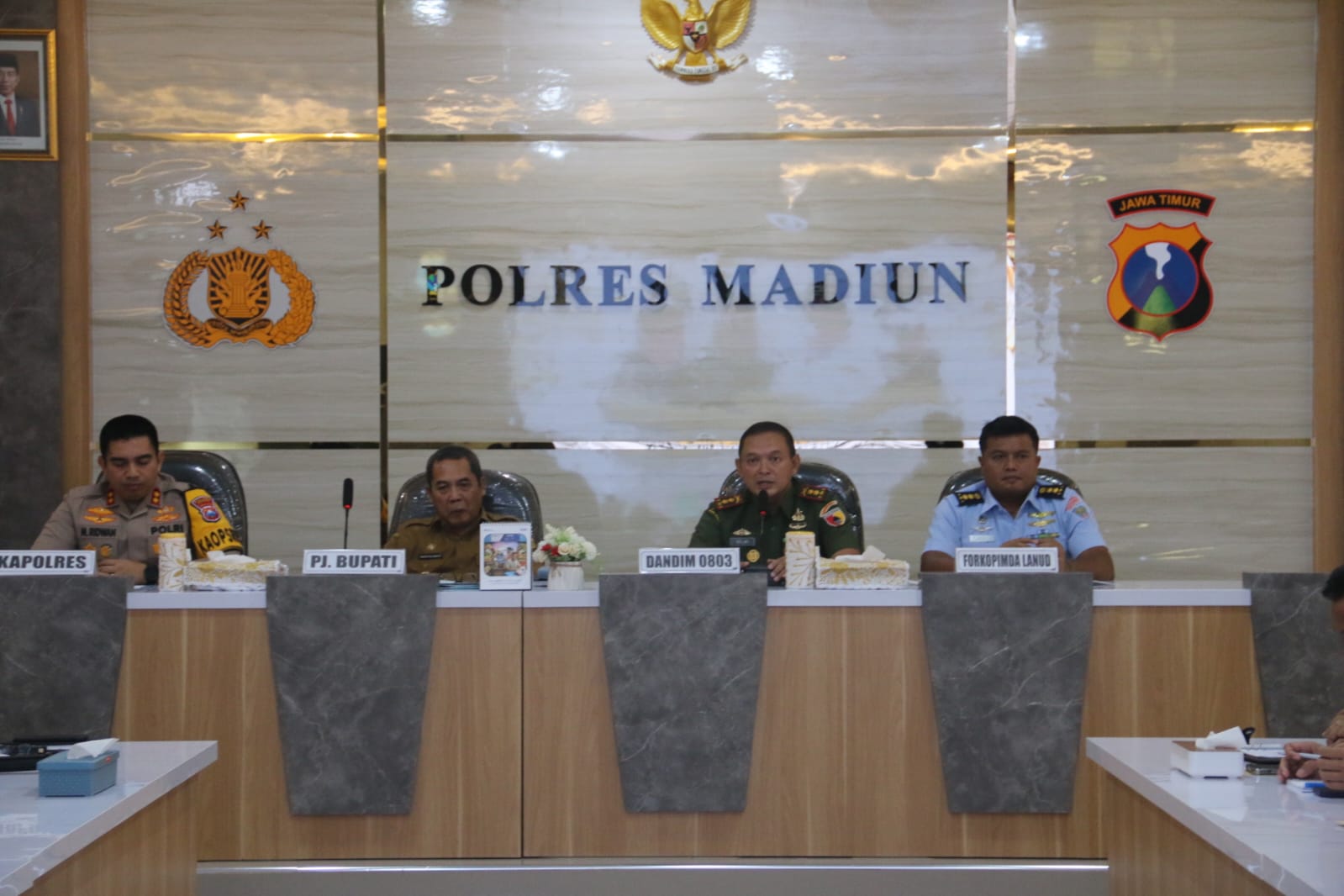 Rakor ini dihadiri oleh Kapolres Madiun AKBP Muhammad Ridwan, Pj Bupati Madiun Tontro Pahlawanto, dan instansi terkait lainnya.