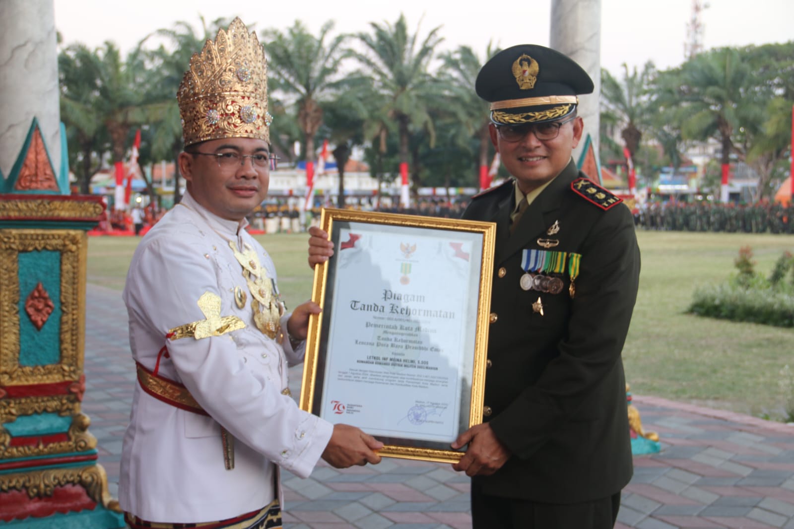Madiun, 18 Agustus 2024 — Dalam upacara peringatan kemerdekaan Republik Indonesia yang berlangsung di Alun-alun Kota Madiun pada Sabtu (17/8), Dandim 0803/Madiun Letkol Inf Meina Helmi menerima penghargaan bergengsi Pura Baya Prasiddhi. Penghargaan ini meliputi Piagam Tanda Kehormatan dan lencana Pura Baya Prasiddhi Emas, sebagai bentuk pengakuan atas dedikasi dan kontribusi luar biasa dalam menjaga keamanan dan ketertiban serta sinergitas dalam pembangunan di wilayah Madiun.