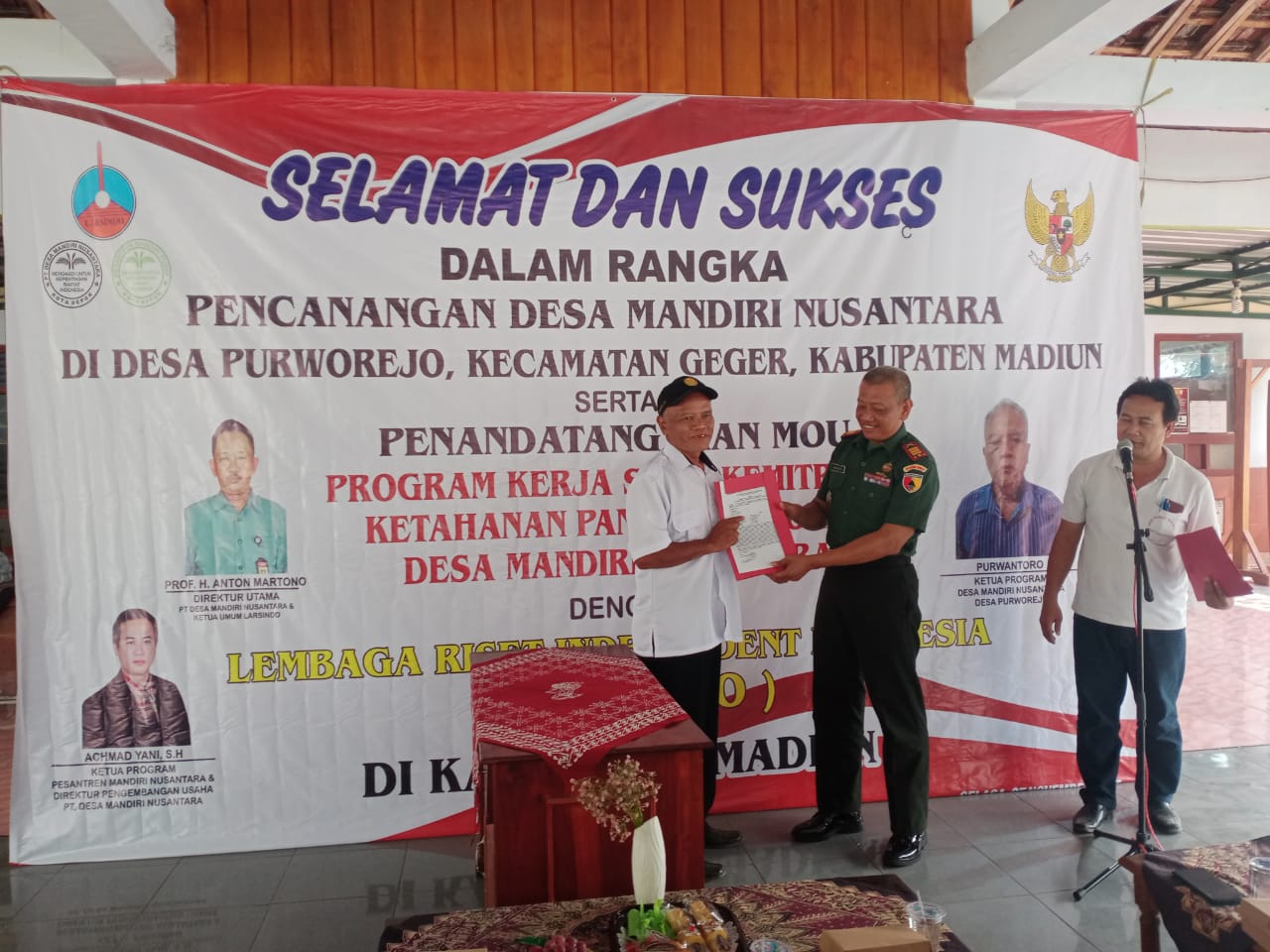 Madiun – Danramil 0803-11/Geger Kapten Inf Muslikin menghadiri kegiatan Pencanangan dan Penandatanganan Memorandum of Understanding (MoU)/ perjanjian kerjasama Program Kerjasama Kemitraan Ketahanan Pangan Nasional Desa Mandiri Nusantara oleh Lembaga Riset Independent Indonesia (Larsindo) dan PT Desa Mandiri dengan kelompok tani di Desa Purworejo, Kec. Geger, Kab. Madiun, Selasa (7/11/2023).