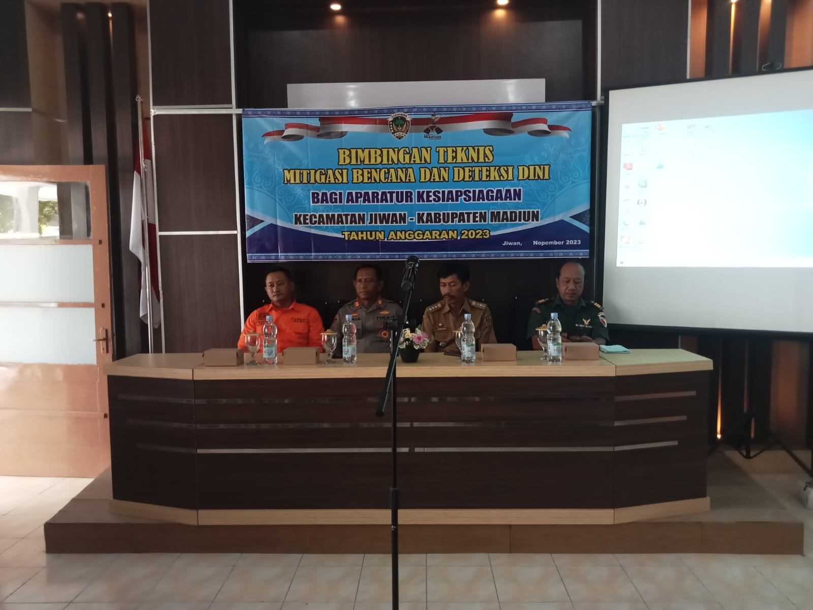 Madiun – Danramil 04/Jiwan Kapten Chb Loso menghadiri kegiatan bimbingan teknis mitigasi bencana dan deteksi dini bagi aparatur kesiapsiagaan wilayah Kecamatan Jiwan tahun 2023, bertempat di Aula Kantor Kecamatan Jiwan Jalan Raya Solo No. 56 Desa Jiwan, Kecamatan Jiwan, Kabupaten Madiun. Rabu (8/11/2023).