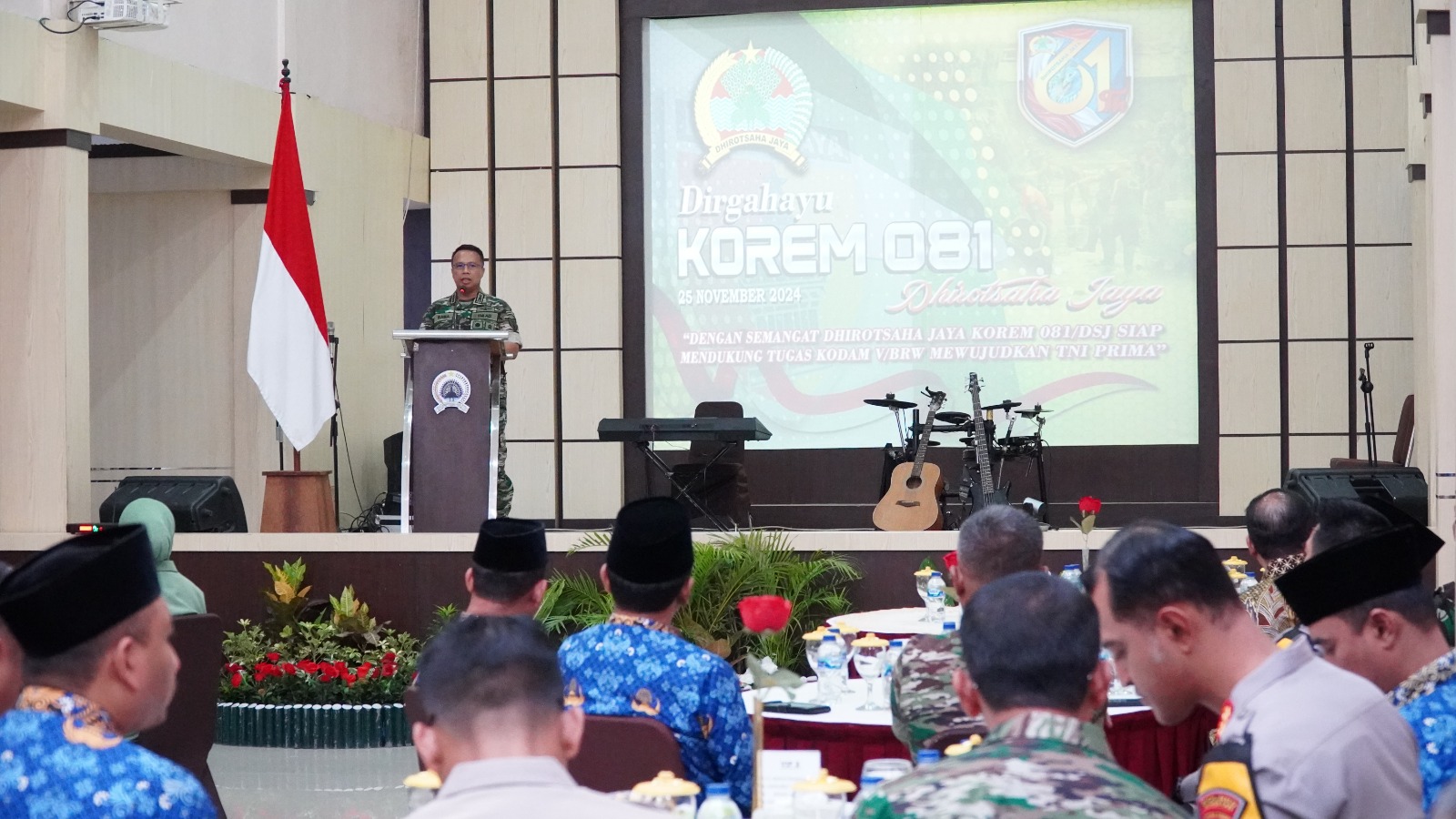 “Terima kasih dan penghargaan setinggi-tingginya kepada seluruh prajurit, rekan-rekan dari kepolisian dan pemerintah daerah, serta seluruh pihak yang telah memberikan supportnya, sehingga Korem 081/DSJ telah melakukan tugasnya dengan berhasil,” kata Pamen TNI AD abituren Akmil 1998 itu dalam sambutannya pada acara syukuran HUT ke-61 Korem 081/DSJ di Aula Jenderal Sudirman Makorem, Kota Madiun, Jumat (29/11/2024).