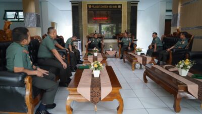 Komandan Korem 163/Wirasatya Brigjen TNI Agus M. Latif menerima kunjungan kerja dari Komandan Pusat Teritorial TNI Angkatan Darat (Danpusterad) Letjen TNI Teguh Muji Angkasa, beserta Tim Bimbingan Teknis Temu Cepat Lapor Cepat di Loby Makorem 163/Wirasatya yang bertempat di Jalan PB. Sudirman Denpasar, Rabu (12/4/2023).