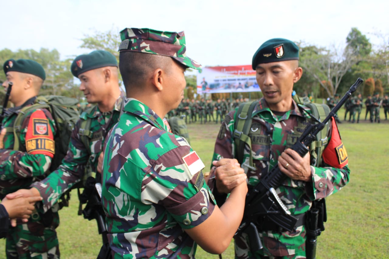 Danyonmarhanlan XI bersama para undangan lainnya kepada personel Satgas menyampaikan ucapan terimakasih dan selamat jalan serta selamat bertemu kembali dengan keluarga dirumah.