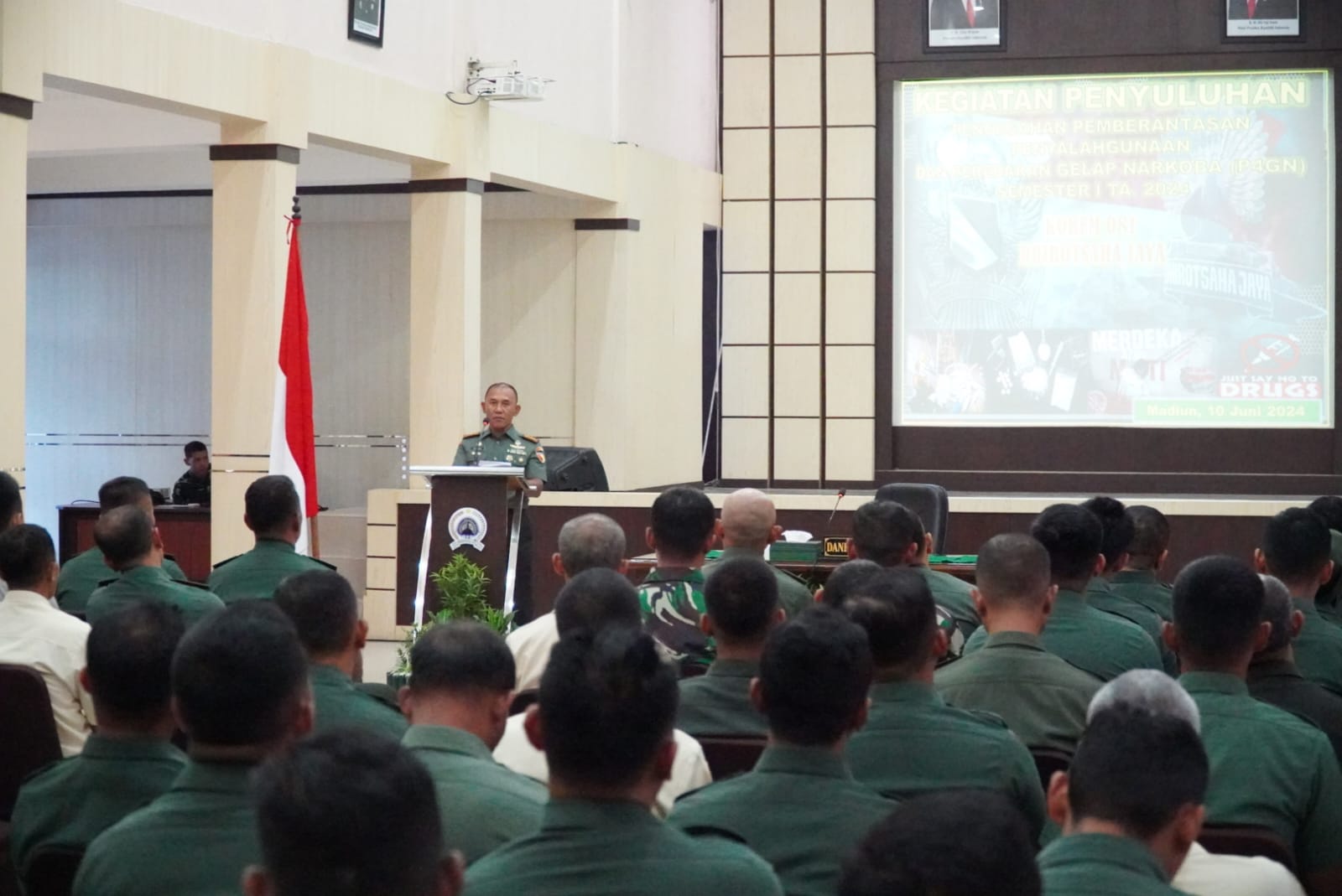 “Jika kita mencermati berita di berbagai media, begitu banyak informasi yang beredar mengenai meluasnya peredaran Narkoba hingga ke pelosok-pelosok negeri. Terlebih juga sudah menyasar generasi muda dan pelajar,” kata Danrem pada sosialisasi Pencegahan dan Pemberantasan Penyalahgunaan dan Peredaran Gelap Narkotika (P4GN) di Aula jenderal Sudirman Makorem 081/DSJ, Jl. Pahlawan No. 50 Kota Madiun, Senin (10/6/2024).