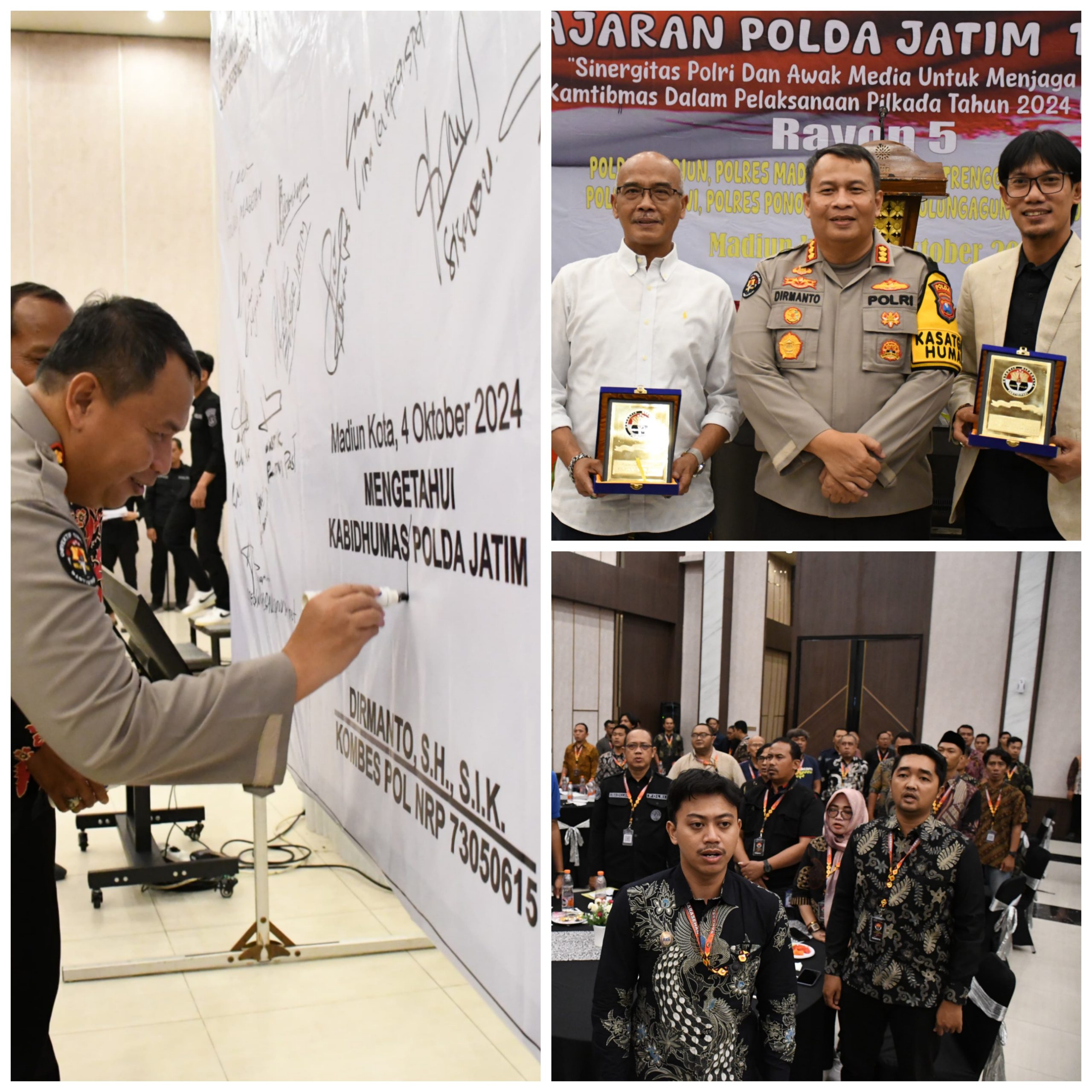 MADIUN,BUSERJATIM.COM GROUP – Pada tanggal 4 Oktober 2024, awak media Jawa Timur menggelar Deklarasi Pilkada Aman dan Damai di Sun City, Kabupaten Madiun. Acara ini diadakan sebagai bentuk komitmen bersama dalam mendukung penyelenggaraan Pemilu Kepala Daerah (Pilkada) 2024 yang aman, damai, dan kondusif. Deklarasi ini dihadiri oleh berbagai elemen penting, termasuk Kepala Divisi Humas Polda Jawa Timur, Kombes Pol Dirmanto, S.H., S.I.K., serta perwakilan dari Komisi Pemilihan Umum (KPU) dan Persatuan Wartawan Indonesia (PWI) Jawa Timur.