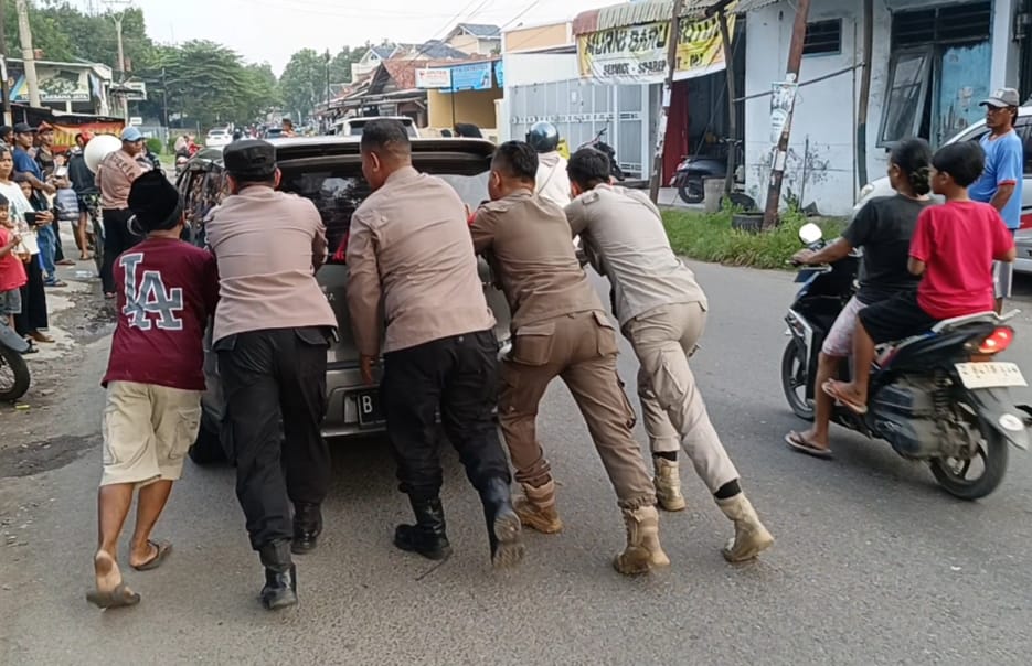 Tanpa ragu-ragu, para personel yang sedang berjaga segera bertindak dengan sigap memberikan bantuan. Mereka ikut mendorong kendaraan roda empat tersebut agar bisa dipindahkan dari lokasi mogoknya.