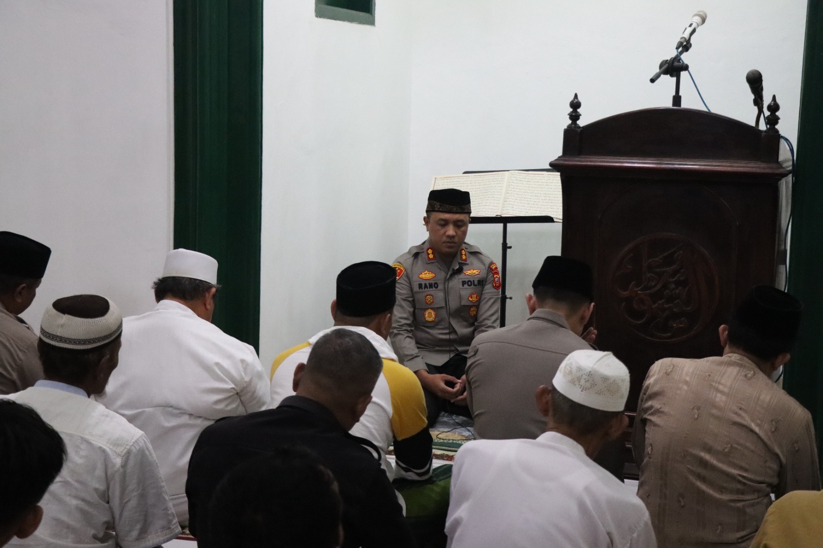 Tiba di masjid tersebut, Kapolres mengumandangkan adzan dan menjadi imam sholat Isya berjamaah di lanjut menggelar Yasinan setelah itu Berdialog yang dihadiri Tokoh Agama,Tokoh Masyarakat serta Warga dan sejumlah Pejabat Utama Polres Cirebon Kota.